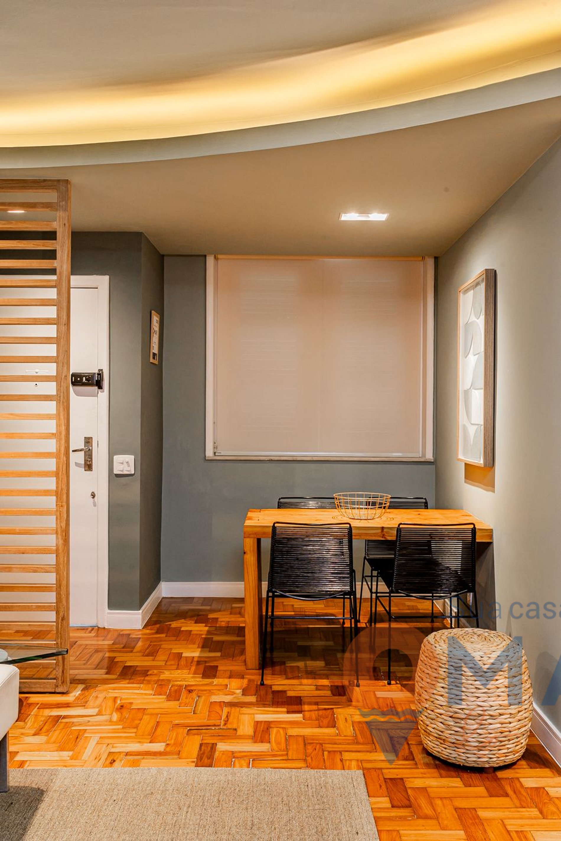 Sala: sofá-cama (188cm x 155cm), cadeira, mesa bistrô carrinho, mesa de jantar com cadeiras e cortina translúcida.