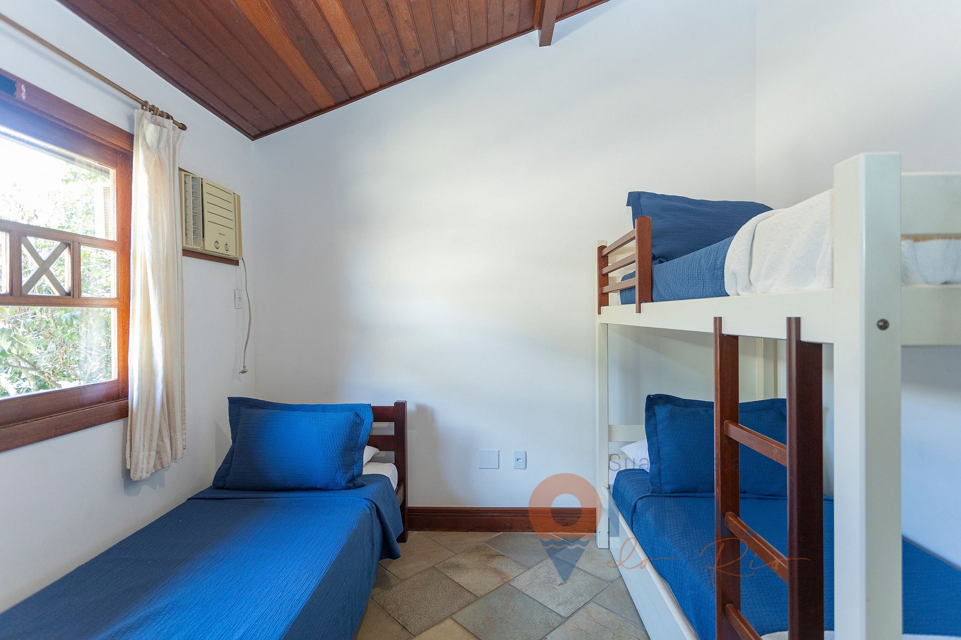 Suíte 3 - 2º andar: bicama solteiro, beliche solteiro, ar-condicionado, ventilador de teto, Smart TV 46", cortina, arara de roupas com cabides, cômoda e espelho de corpo inteiro.