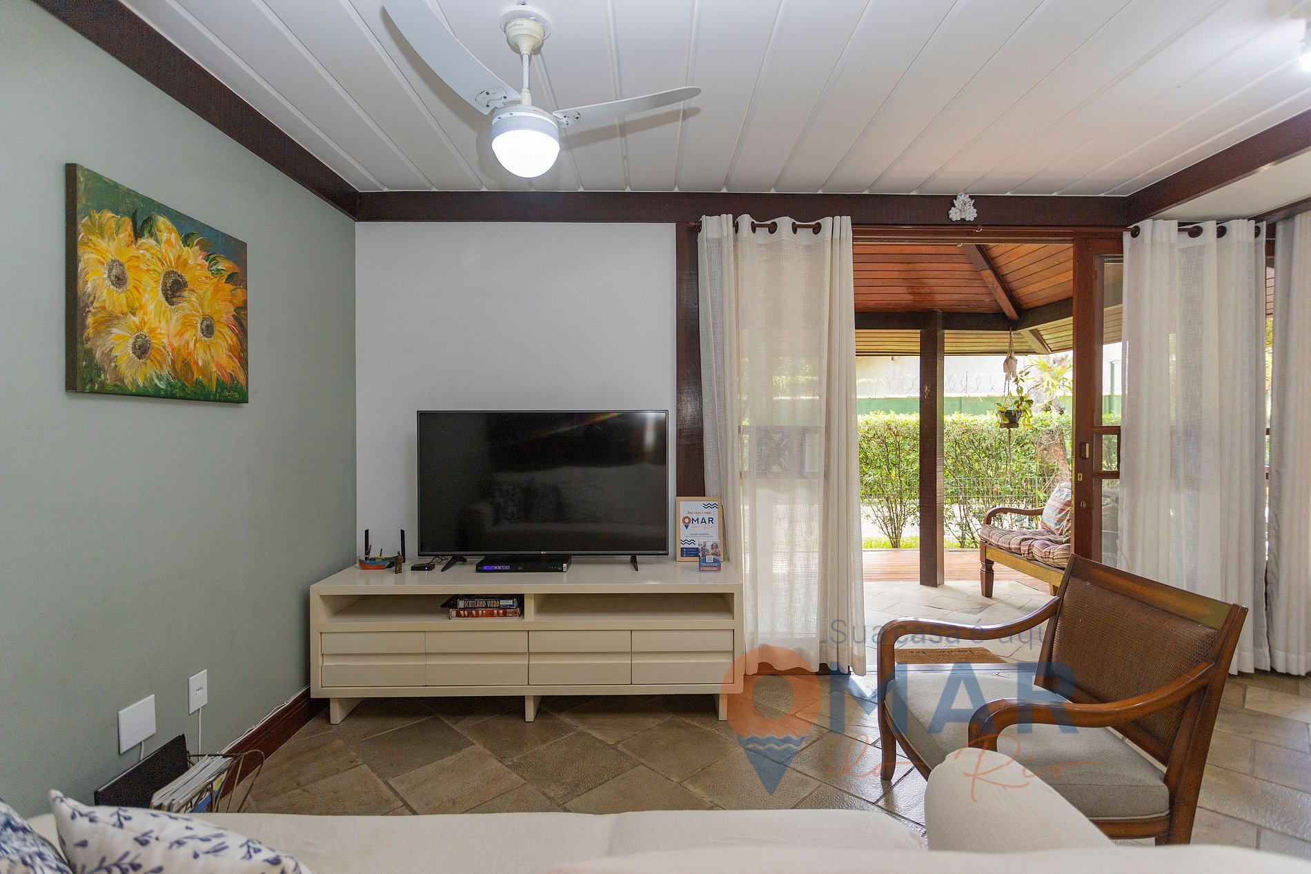 Sala de estar - 1º andar: sofá, poltrona, Smart TV 55", ar-condicionado split, ventilador de teto, mesa de jantar com assentos e cortina.