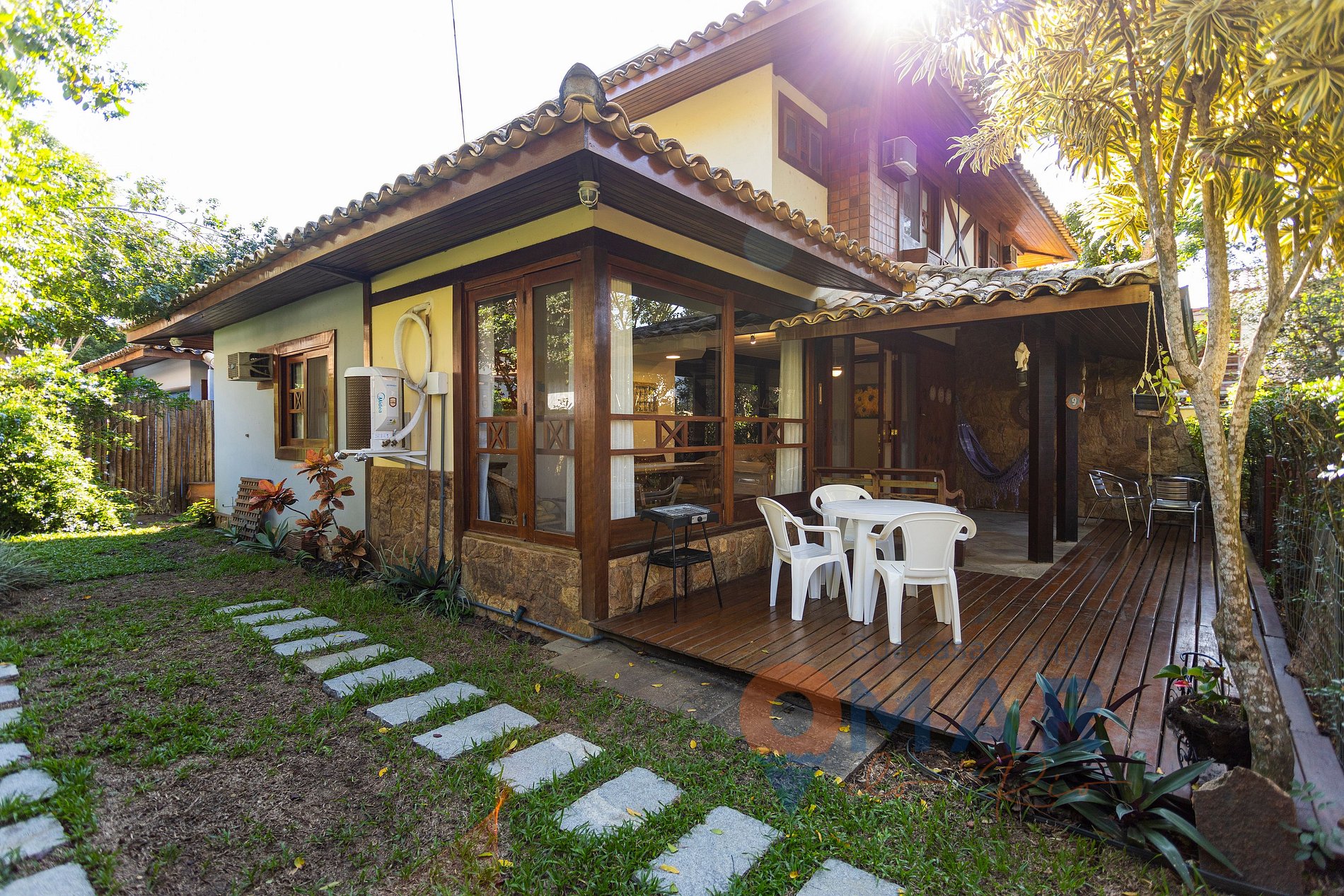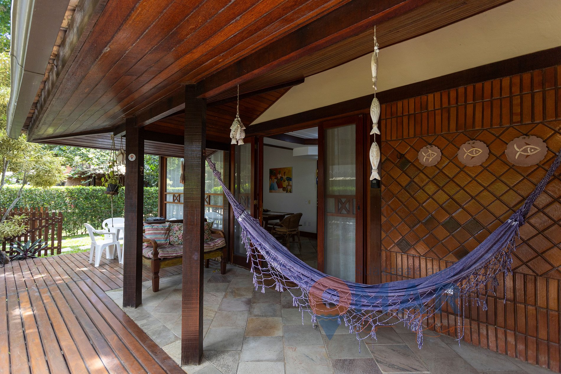 Varanda: churrasqueira portátil, mesas com cadeiras, rede de descanso e banco de madeira.