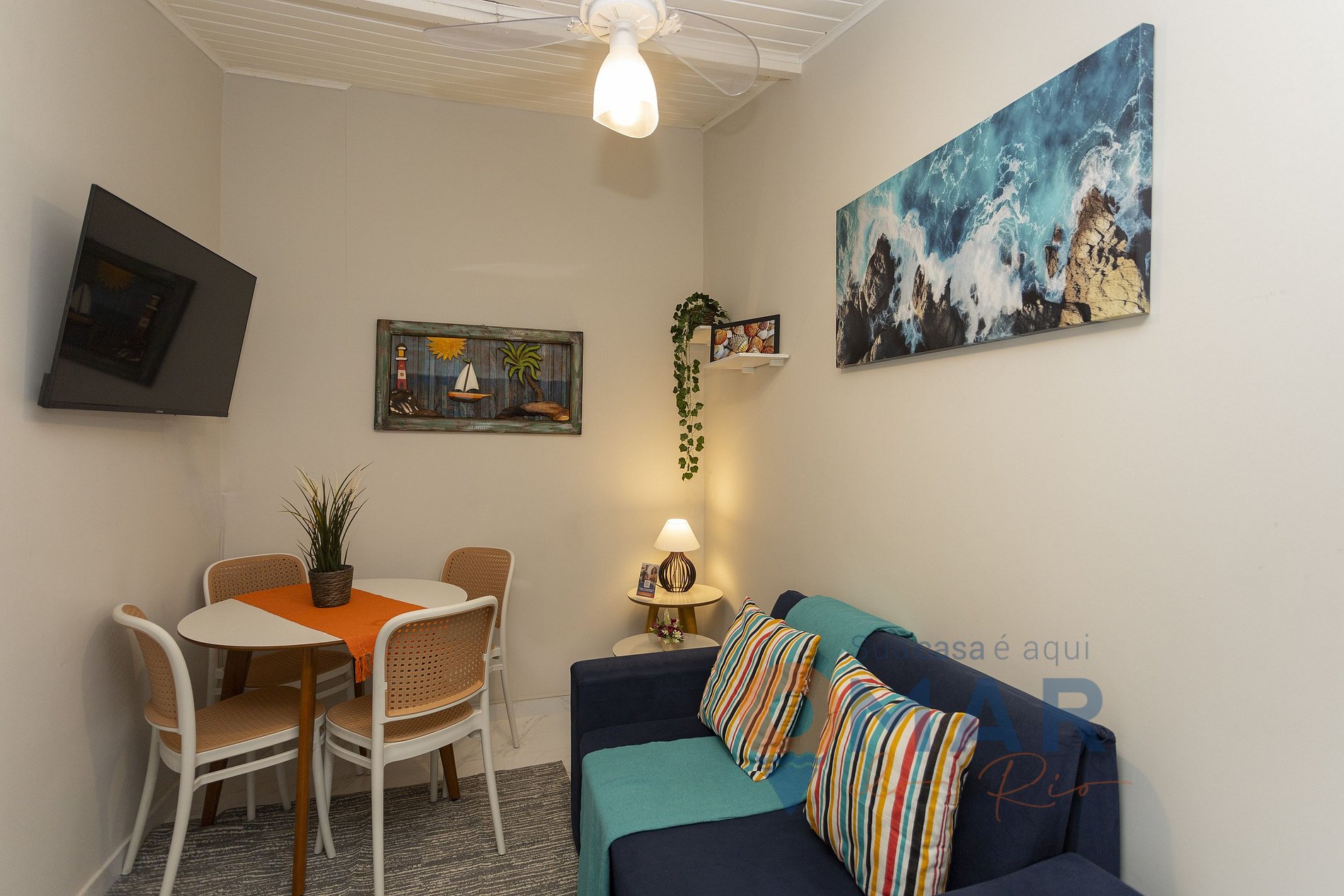 Sala: Sofá-cama, Smart TV 43'' com canais abertos (Via UniTV), ventilador de teto e mesa de jantar com assentos.