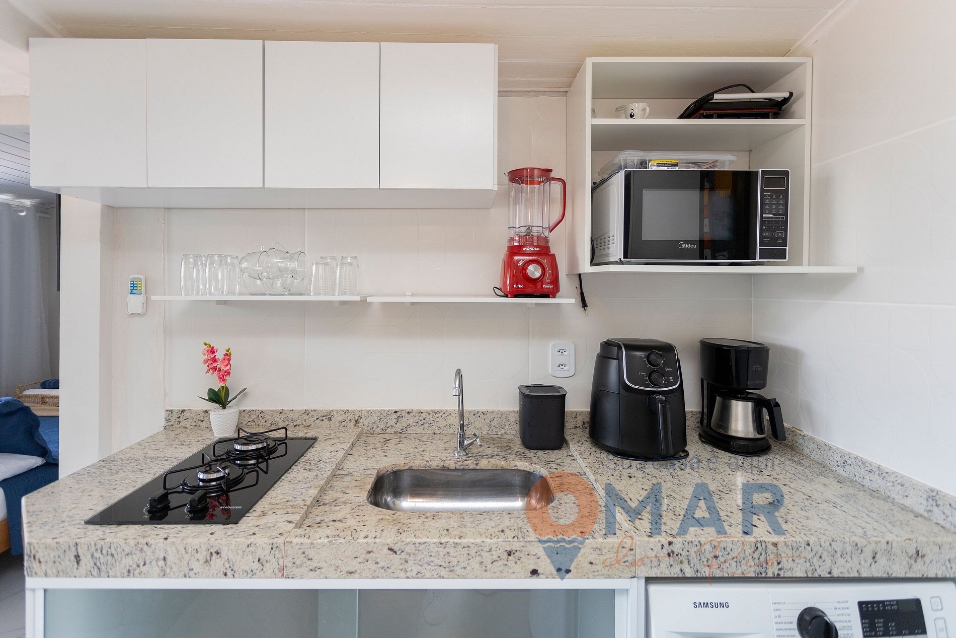 Cozinha: Cooktop 2 bocas, geladeira, micro-ondas, cafeteira, airfryer, sanduicheira, liquidificador e utensílios de cozinhar.