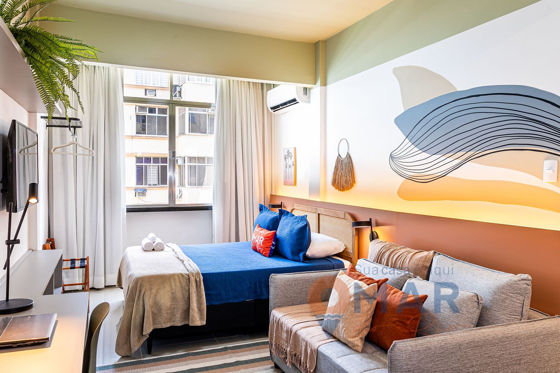 Studio: Cama Queen Size (198cm x 158cm), Sofá-cama (188cm x 138cm) - apenas para crianças, ar-condicionado split, Smart TV com canais à cabo (Claro TV), workstation, arara de roupas, 2 suportes de malas e uma bancada com 4 banquetas para refeições.