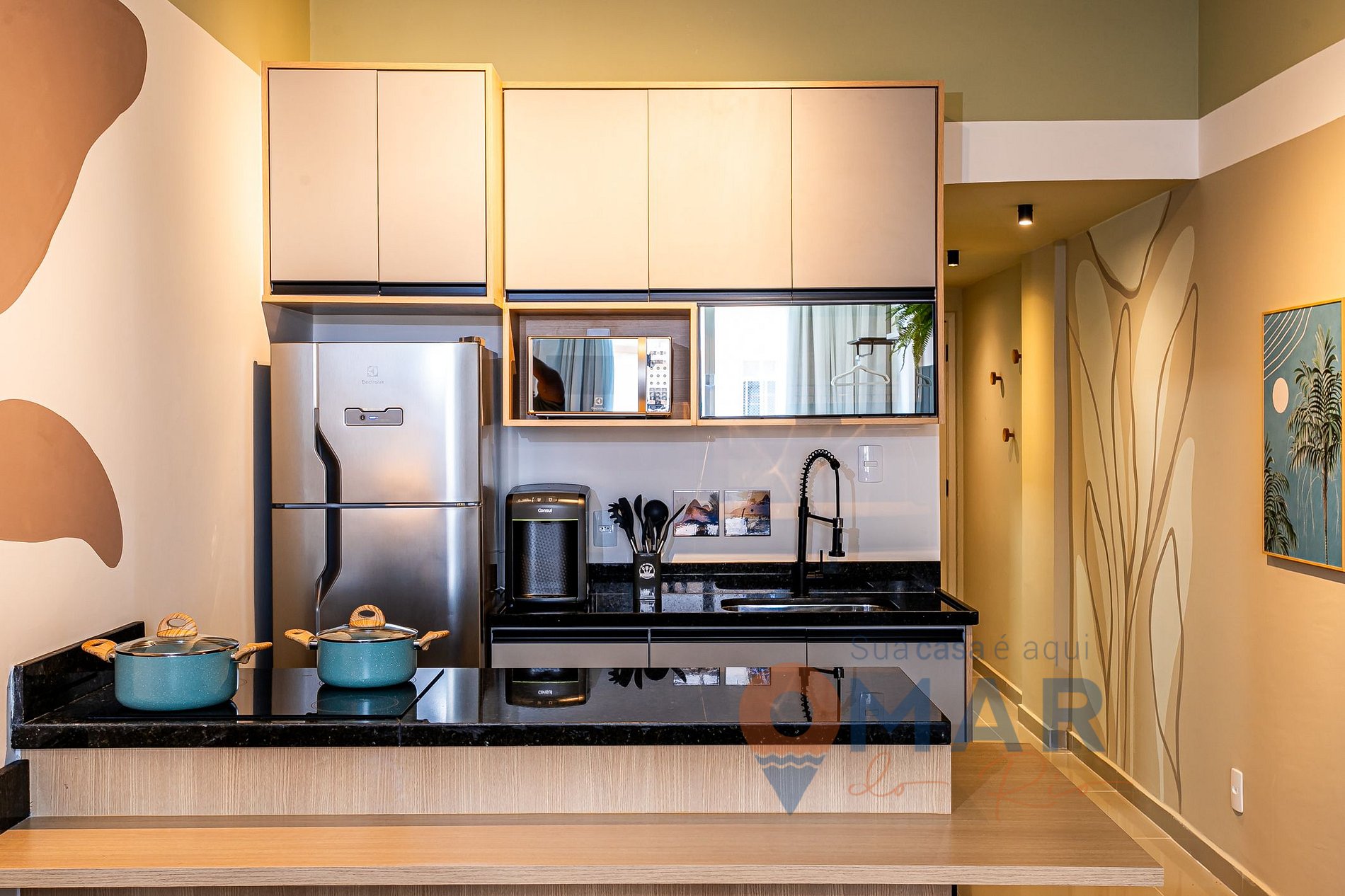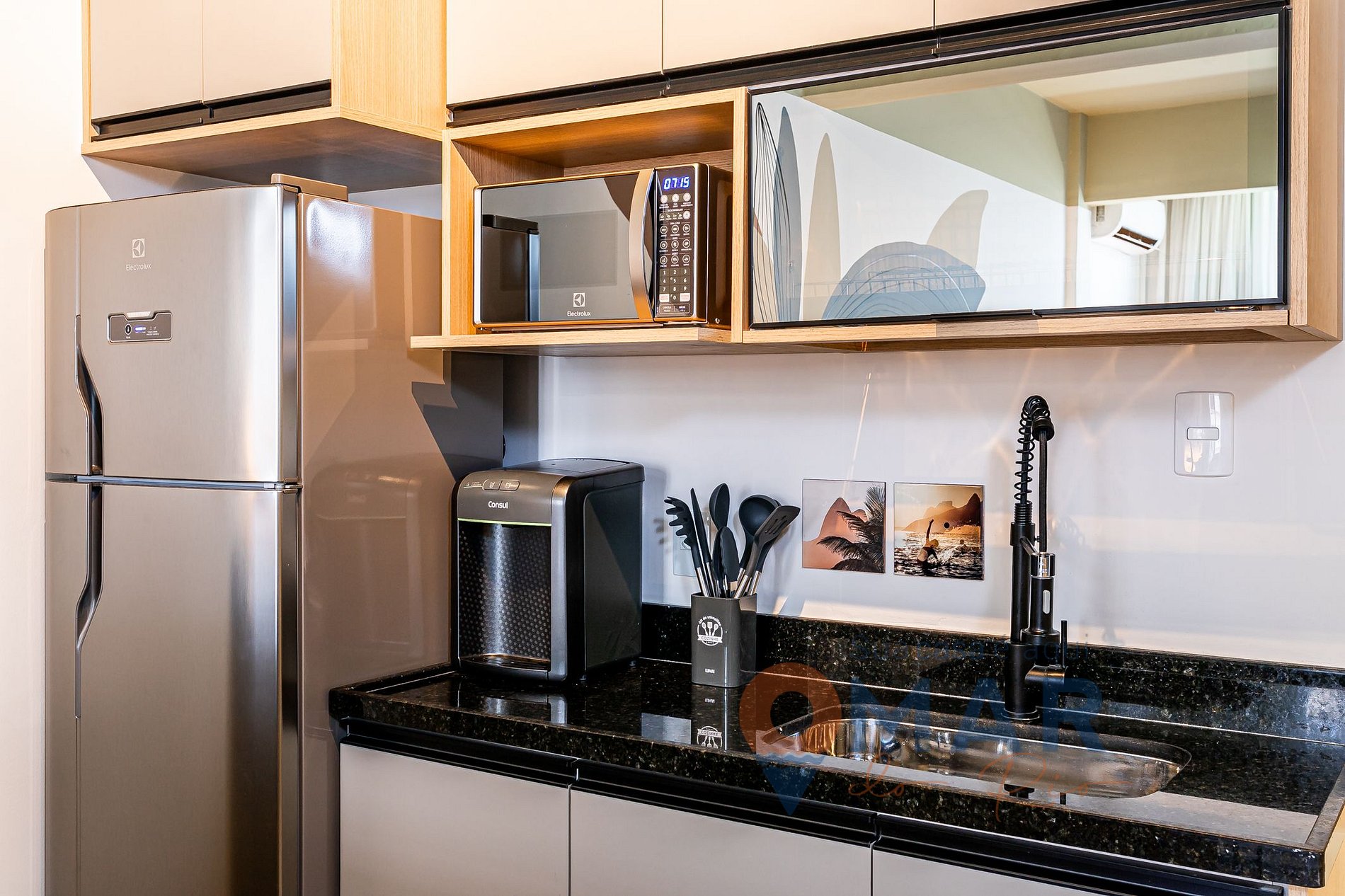 Cozinha: Geladeira, fogão cooktop, micro-ondas, liquidificador, sanduicheira, panelas, filtro d'água, cafeteira comum, cafeteira Nespresso e utensílios de cozinha.