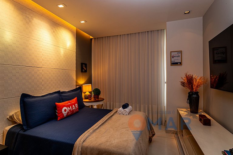 Estúdio: cama casal padrão (188cm x 138cm), ar-condicionado split, Smart TV com canais a cabo (Claro TV), Alexa, sofá, cadeira, mesa de jantar com cadeiras, armário fechado com cabides, e cortina translúcida e blackout.
