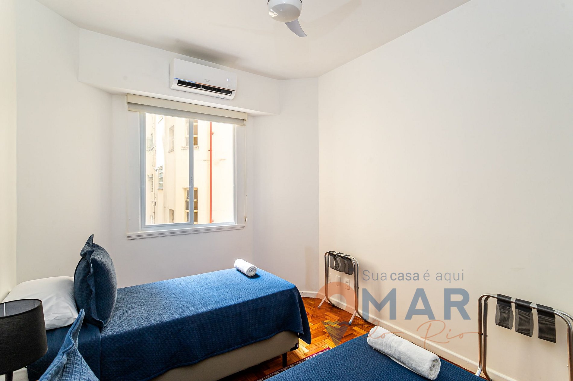 Quarto 3: Duas camas de solteiro (188cm x 88cm), ar-condicionado split, cortina blackout, armário com cabides e 2 porta malas.