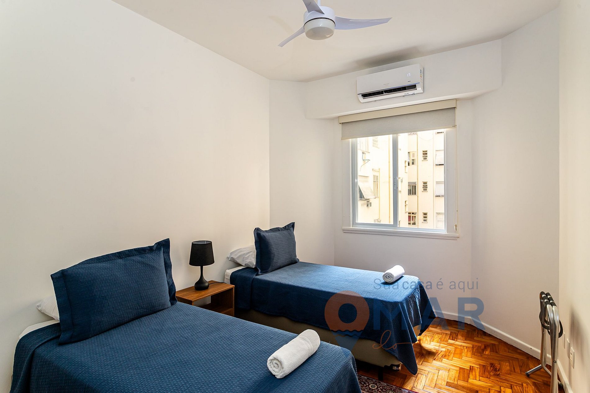 Quarto 3: Duas camas de solteiro (188cm x 88cm), ar-condicionado split, cortina blackout, armário com cabides e 2 porta malas.