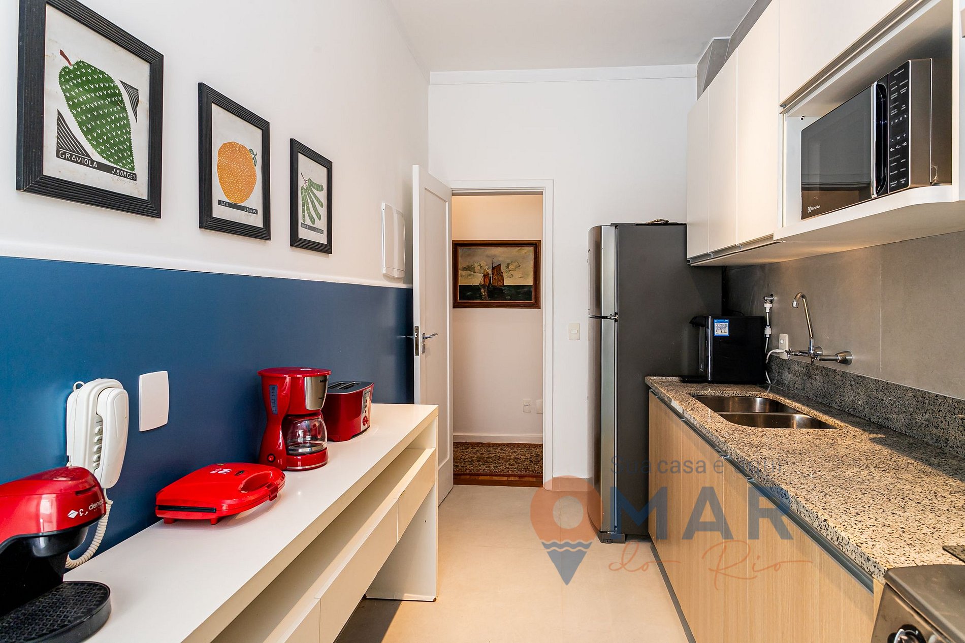 Cozinha: Geladeira, fogão 6 bocas com forno, cafeteira, torradeira, liquidificador, micro-ondas e utensílios de cozinha.