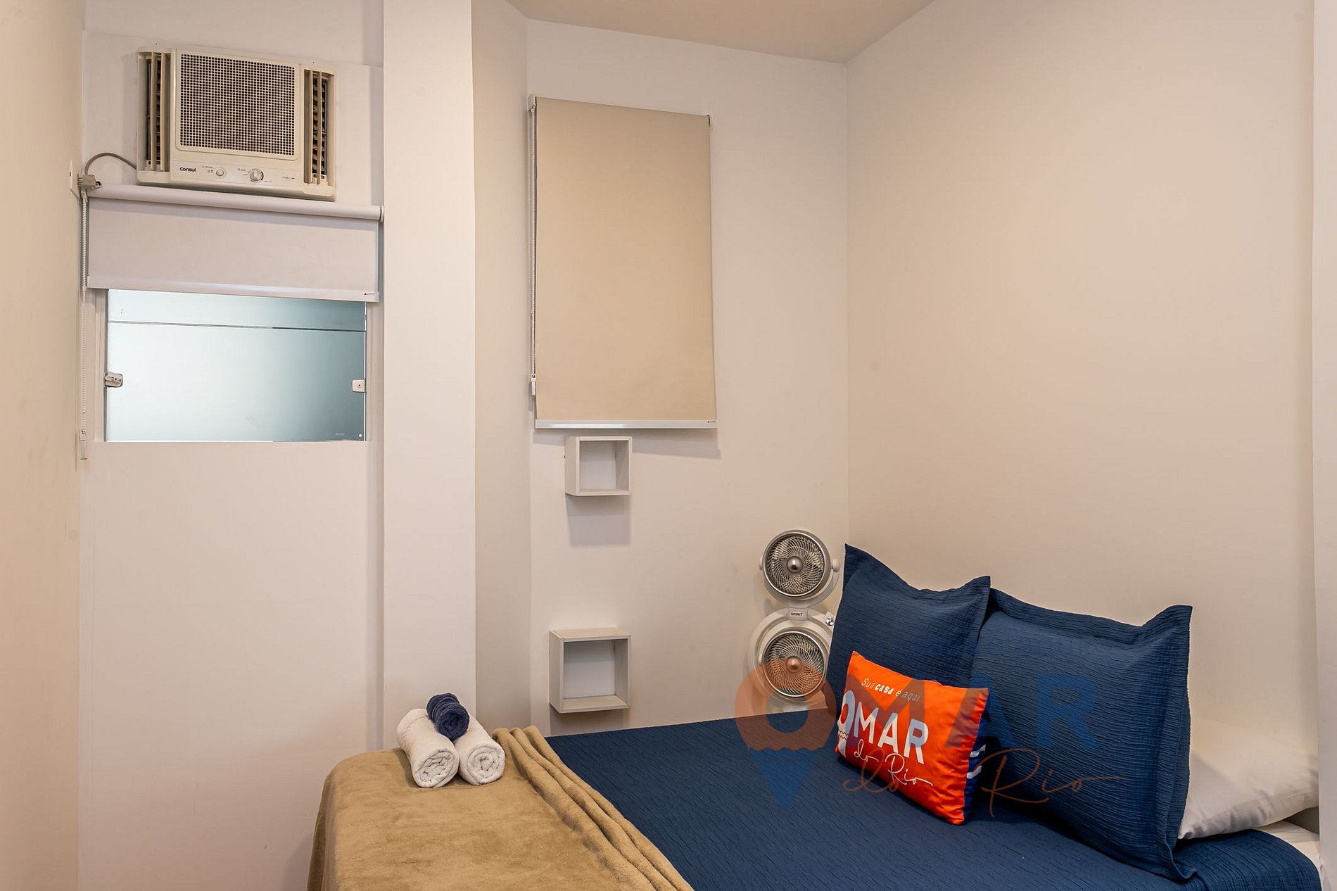 Quarto 2: Cama Casal (1,38cm x 1,88cm), ar-condicionado, cortina blackout, tapete, arara de roupas e 2 porta malas.