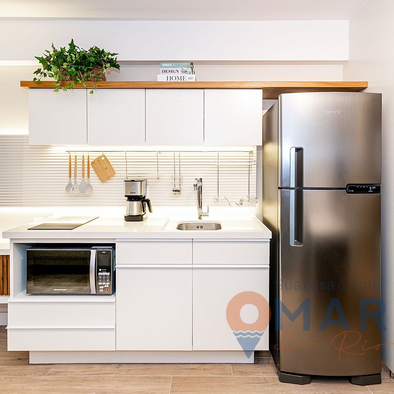 Cozinha: Geladeira, cooktop de indução, micro-ondas, cafeteira comum, filtro d'água embutido na torneira.