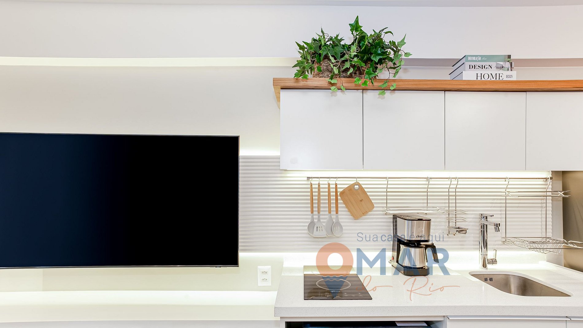 Cozinha: Geladeira, cooktop de indução, micro-ondas, cafeteira comum, filtro d'água embutido na torneira.