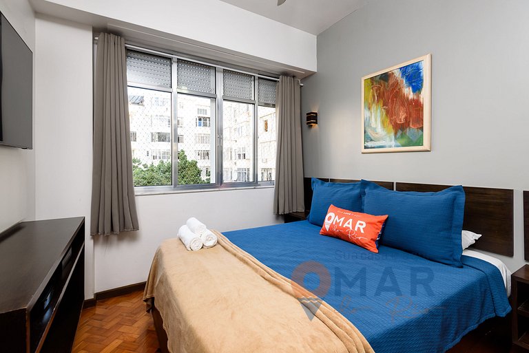 Copacabana está situada na deslumbrante Zona Sul do Rio de Janeiro, sendo amplamente reconhecida por sua maravilhosa praia e um calçadão exuberante revestido com pedras portuguesas brancas e pretas, que formam um mosaico no formato de ondas do mar. Além dessa beleza natural, uma variedade de conveniências aguarda a poucos passos, incluindo mercados, farmácias, restaurantes, lanchonetes e bares, tornando a estadia ainda mais confortável e prática.