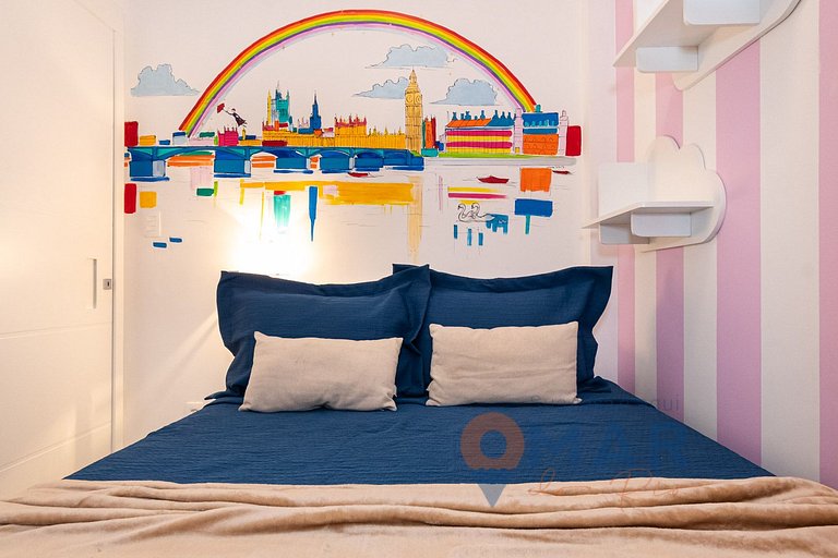 Quarto principal - Itália: Cama Queen (198cm x 158cm), ar-condicionado split, cortina blackout, penteadeira, e guarda-roupas com cabides e espelho de corpo inteiro.