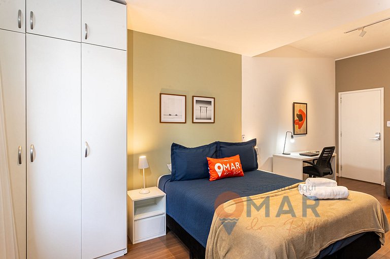 Estúdio: Cama Casal (188cm x 138cm), sofá, ar-condicionado, Smart TV, cortina blackout e mesa com 2 bancos.