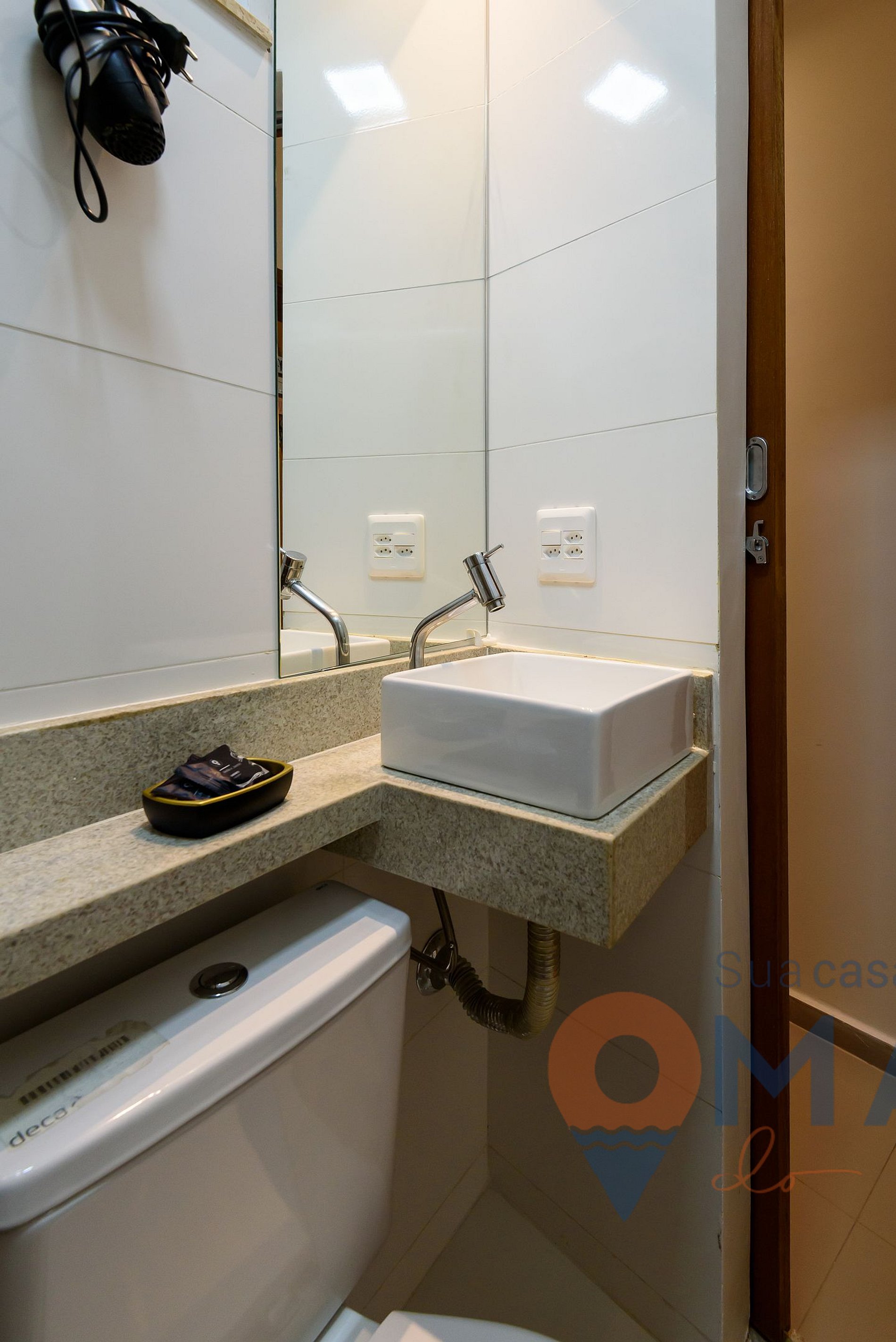 Sala: Sofá-cama (indicado apenas para crianças), Smart TV com canais a cabo pela Claro TV, mesa de jantar com 4 bancos, ventilador de teto e cortina translúcida.