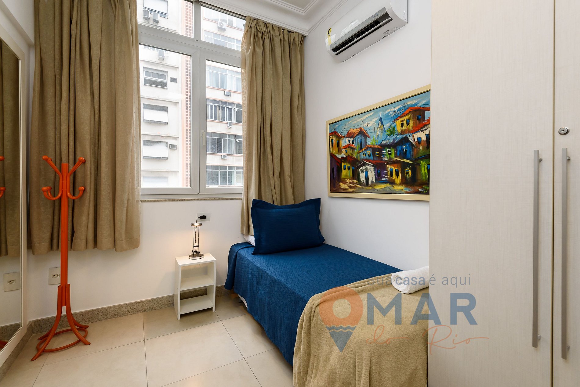 Quarto solteiro: cama de solteiro (188cm x 88cm), ar-condicionado split, armário fechado com cabides, janela antirruído e cortina blackout.