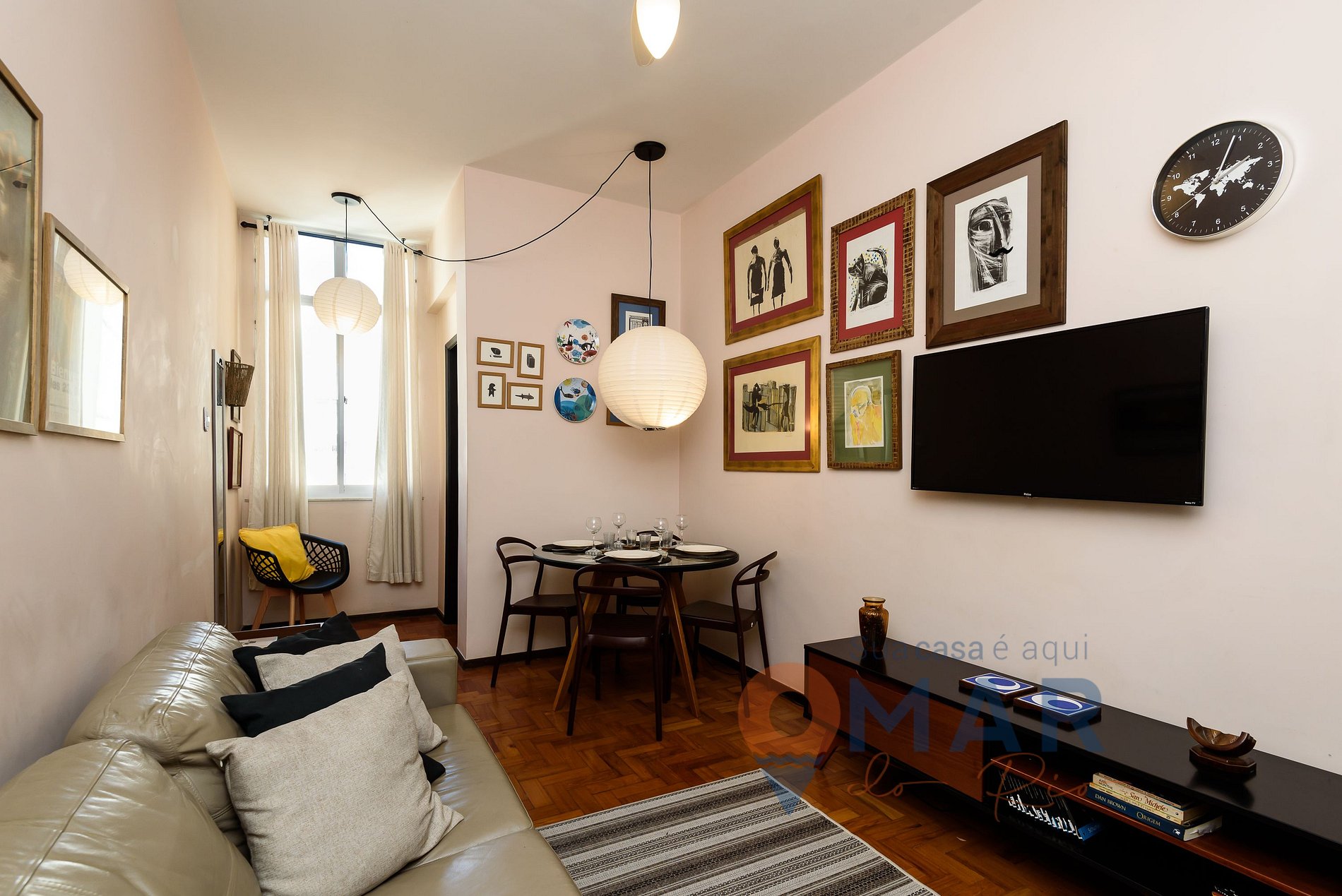 Sala: Sofá, Smart TV com canais abertos (antena digital), mesa de jantar com cadeiras, poltrona, livros e cortina translúcida.