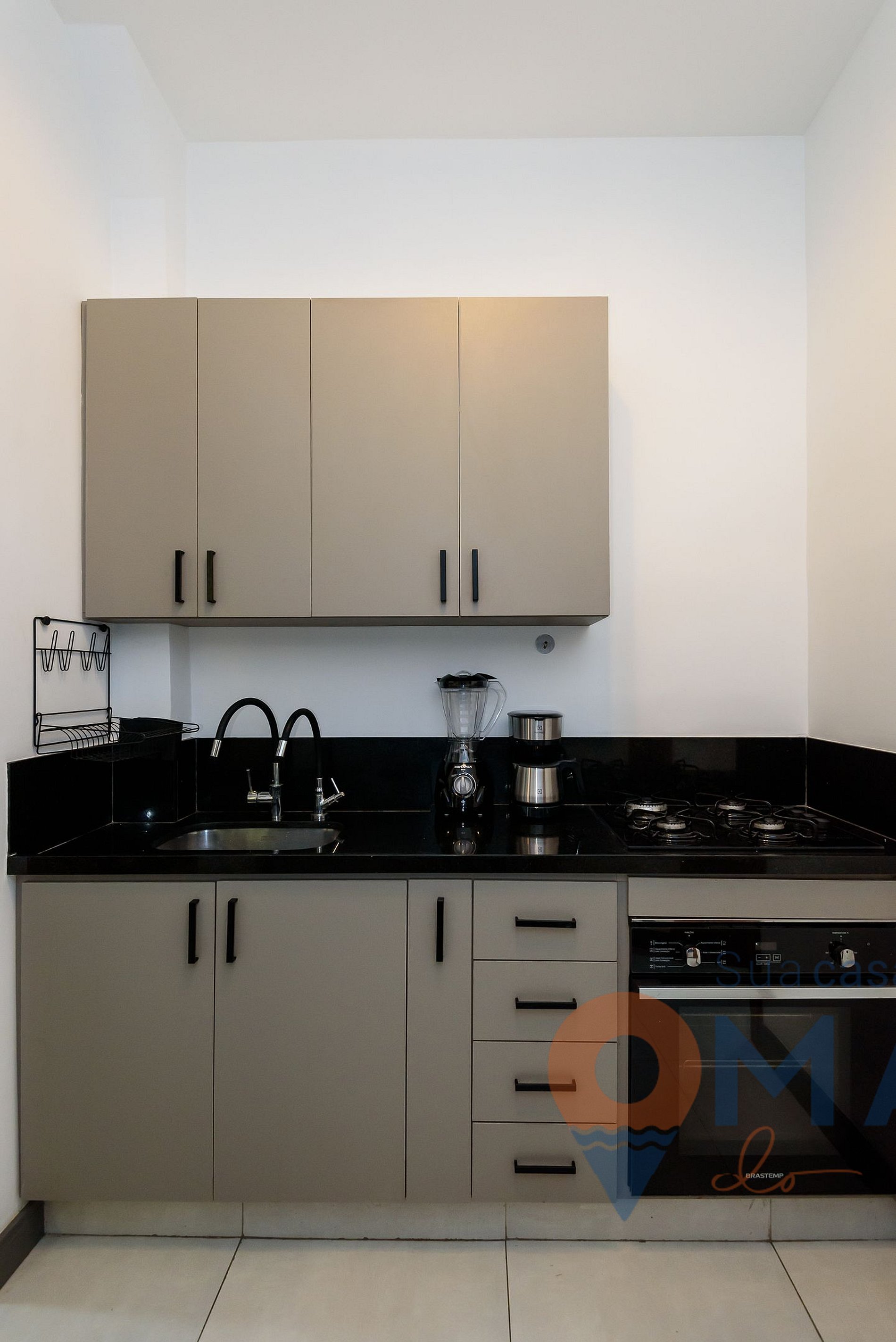 Cozinha: cooktop 2 bocas, geladeira, forno, micro-ondas, cafeteira elétrica, liquidificador, torneira com água filtrada, mesa retrátil e utensílios.