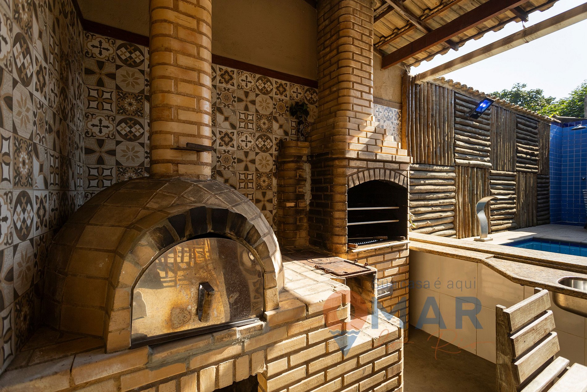 Área Gourmet: piscina ao ar livre com 1,50m de profundidade, chuveirão, espreguiçadeiras, churrasqueira com grelha, forno a lenha, freezer, pia, mesa com cadeiras, rede de descanso, bancada com banquetas e lavabo.