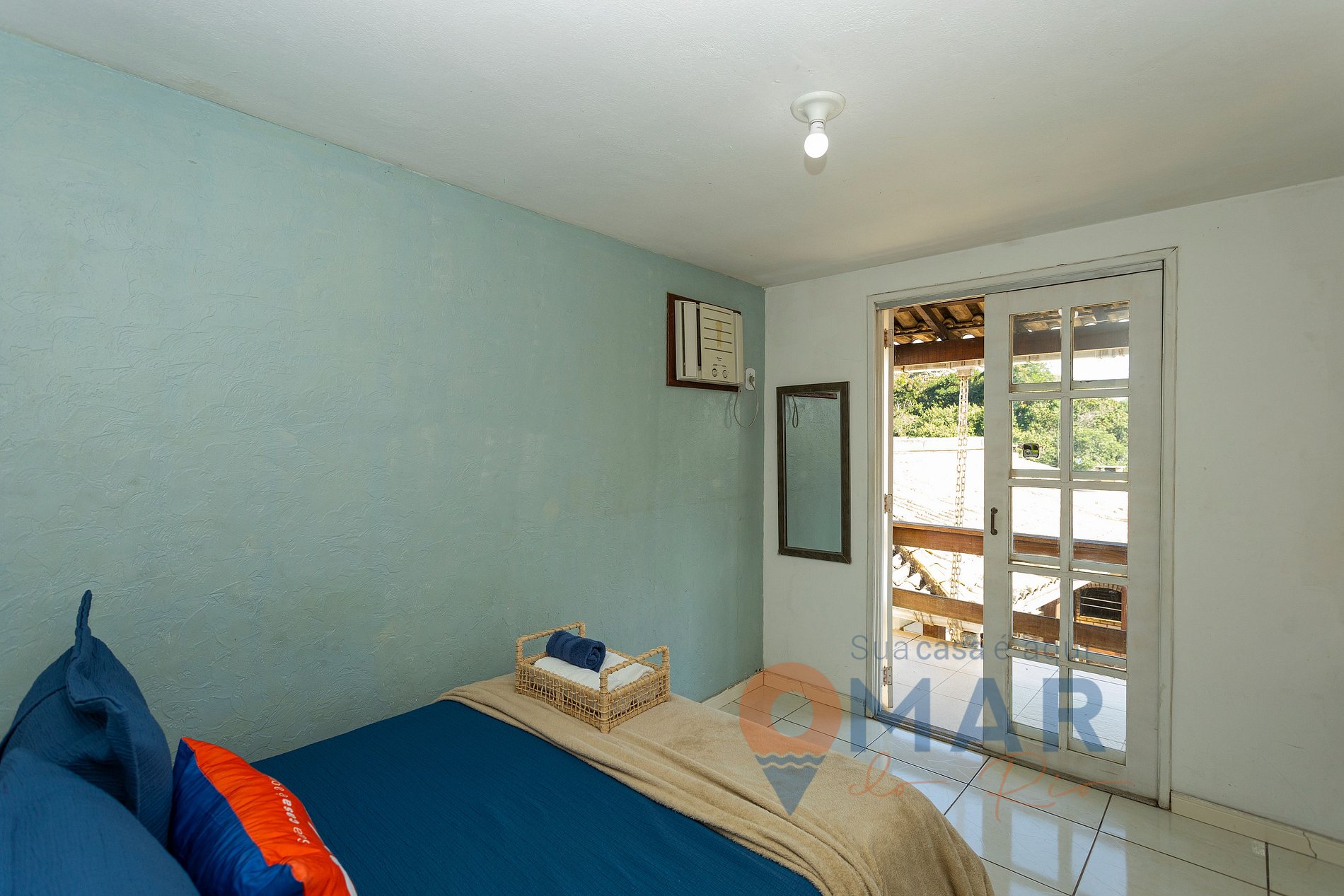 Quarto 1 (2º andar - Vista Mar e Área Gourmet): cama casal (188cm x 138cm), ar-condicionado, bancada com puff e espelho de corpo inteiro.