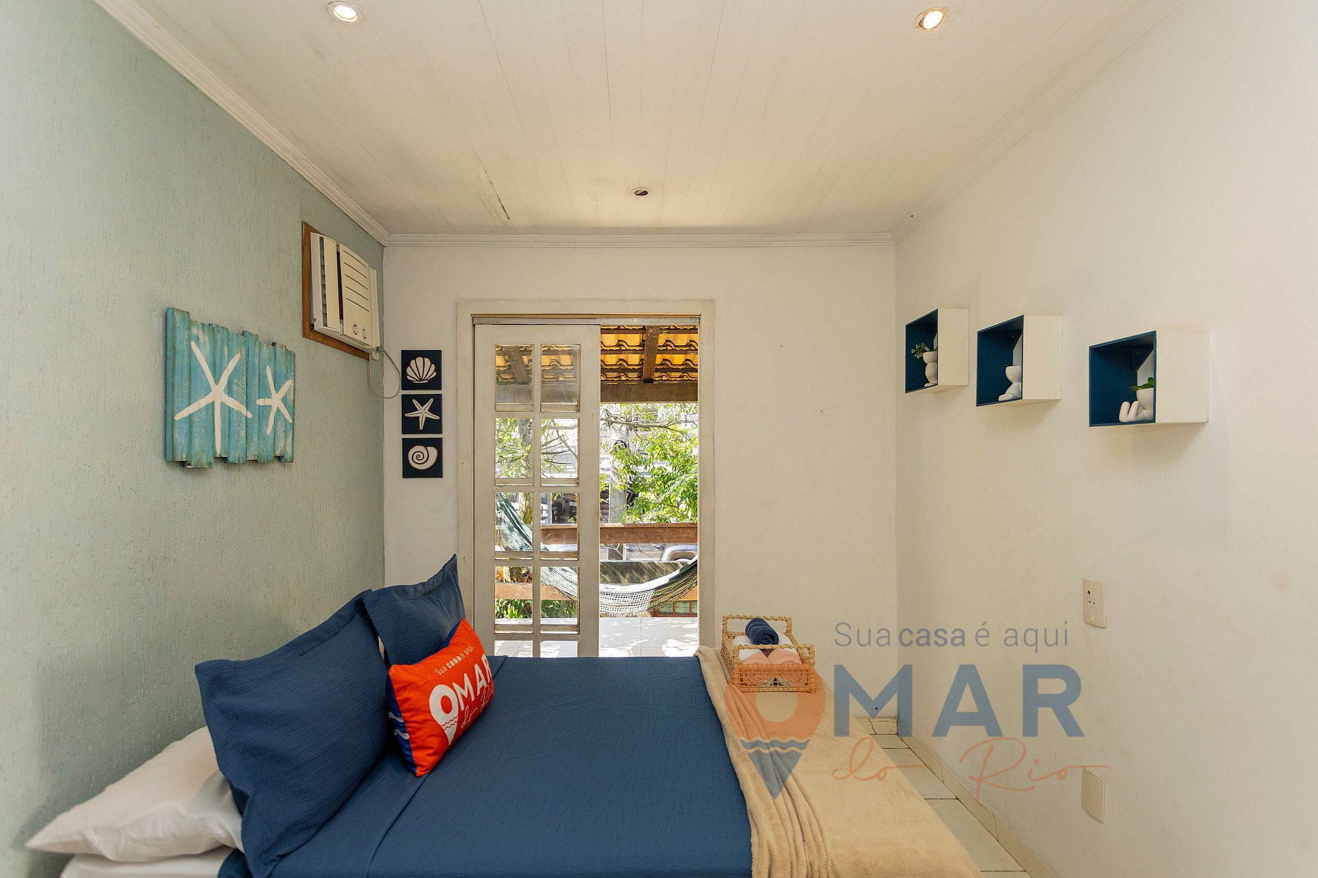 Quarto 3 (2º andar - Varanda com rede): cama casal (188cm x 138cm), ar-condicionado e cômoda.