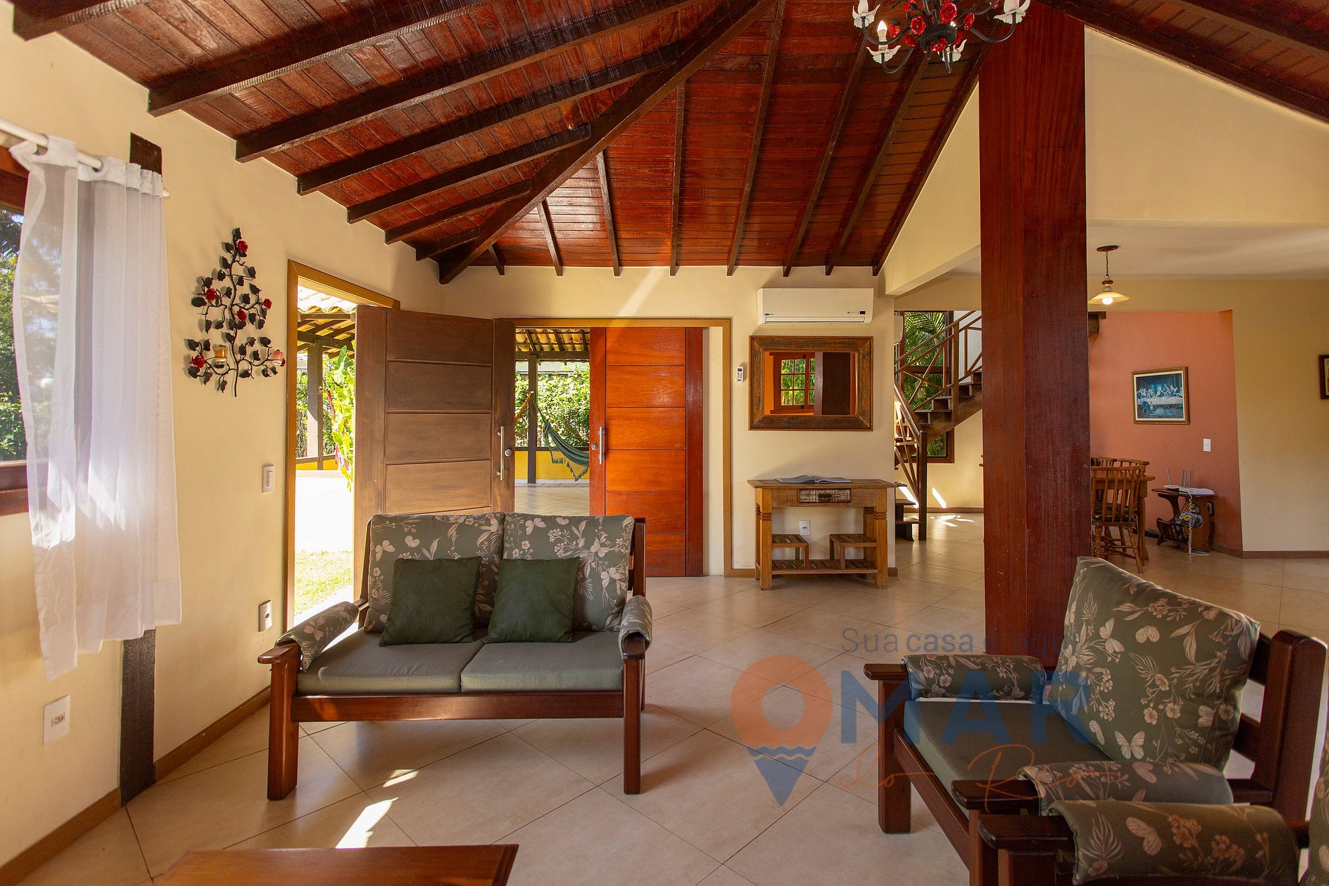 Sala (1ª andar): sofá, poltronas, ar-condicionado split, Smart TV e mesa com cadeiras.