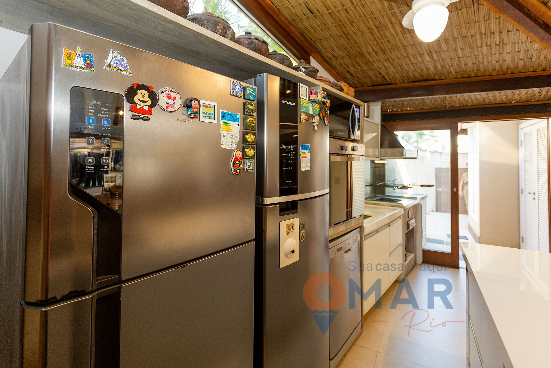Cozinha (1º andar): 2 geladeiras, cervejeira, cooktop 5 bocas, forno, micro-ondas, churrasqueira com grelha, lava louças, air-fryer, cafeteira expresso, chaleira, forno elétrico, sanduicheira, torradeira, espremedor elétrico, batedeira, bebedouro de água natural ou gelada, ventilador de teto e utensílios para cozinhar.
