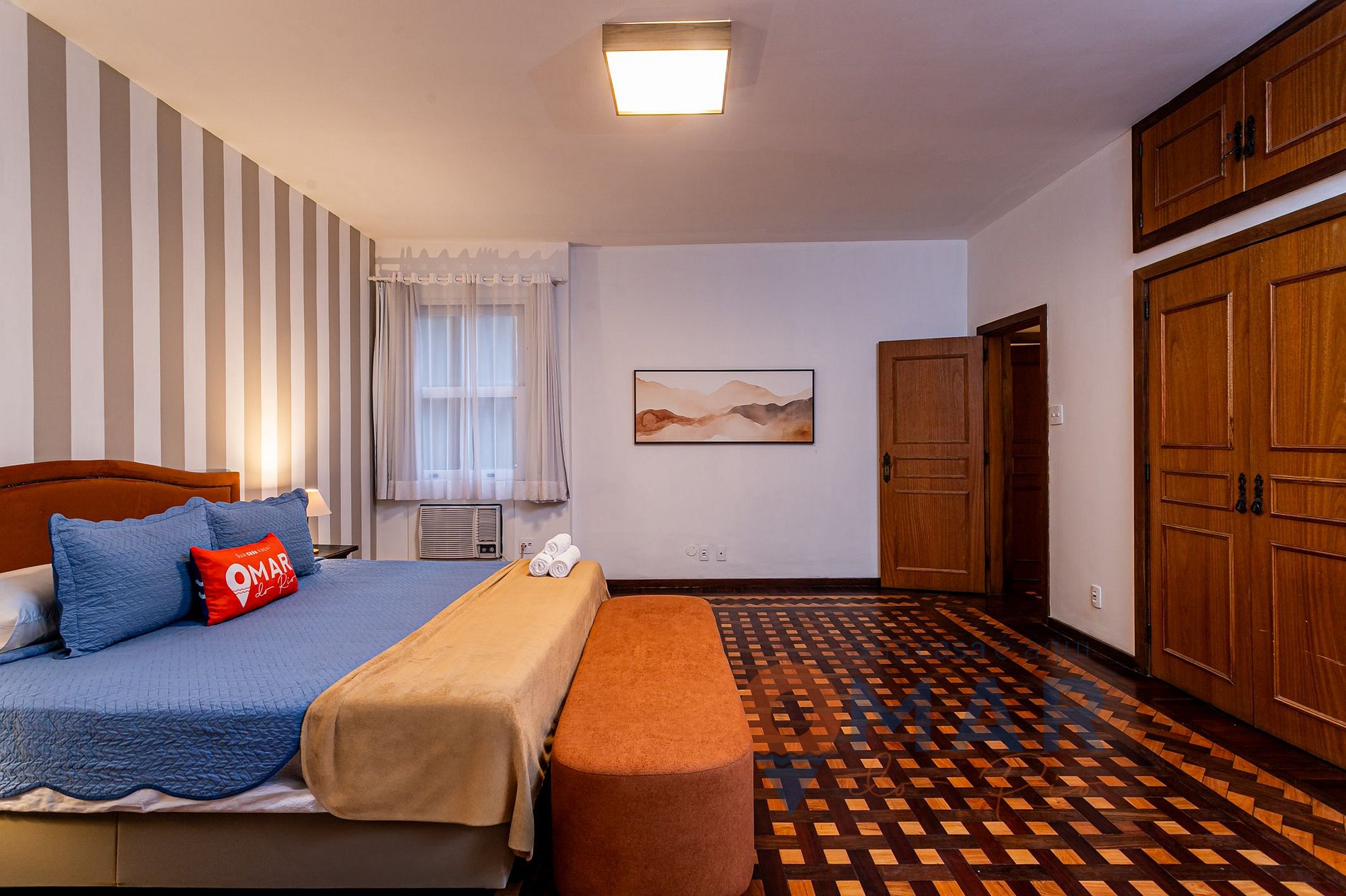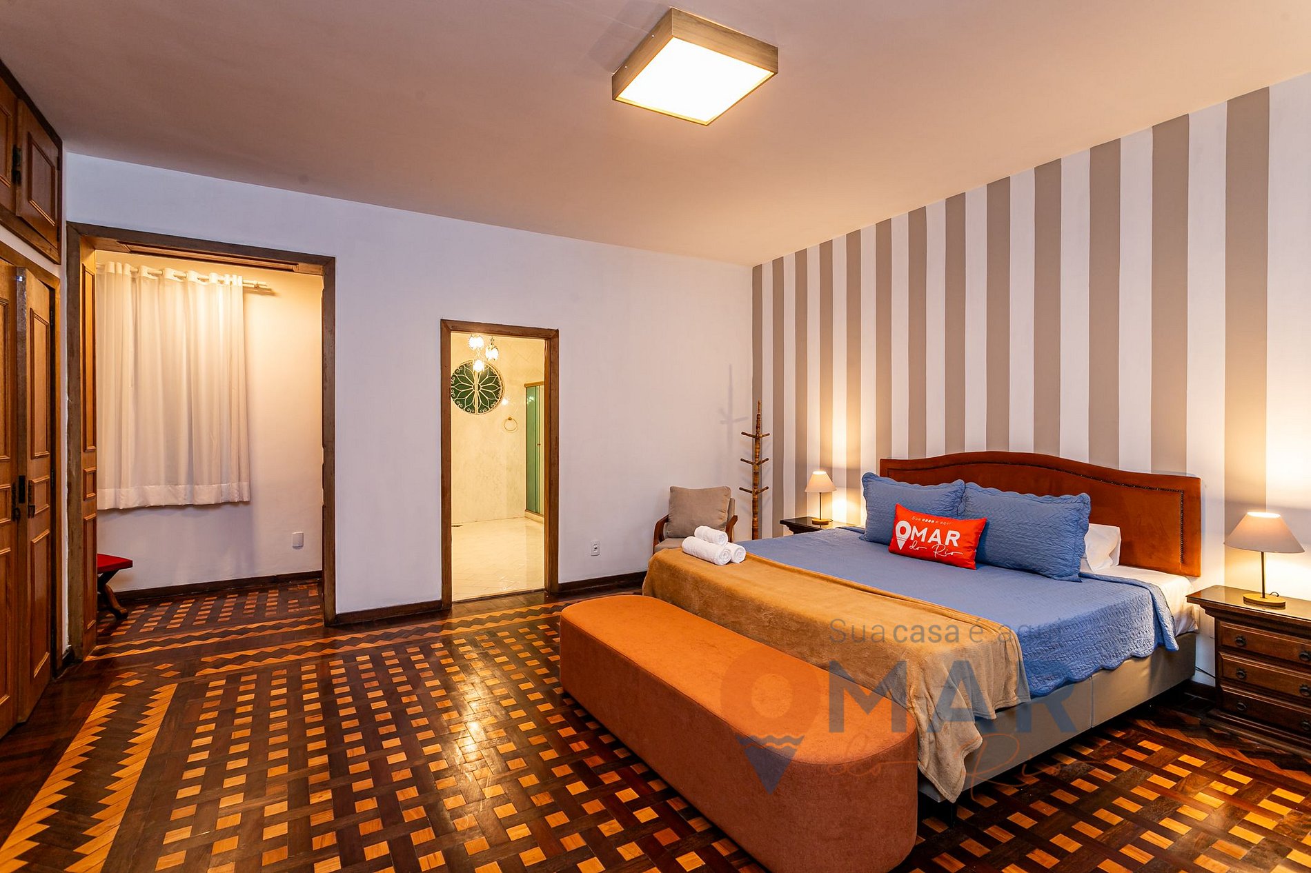 Suíte Principal: Cama King Size (203cm x 193cm), recamier, poltrona, ar-condicionado, cortina blackout e translúcida, armário com cabides e banheira de hidromassagem.