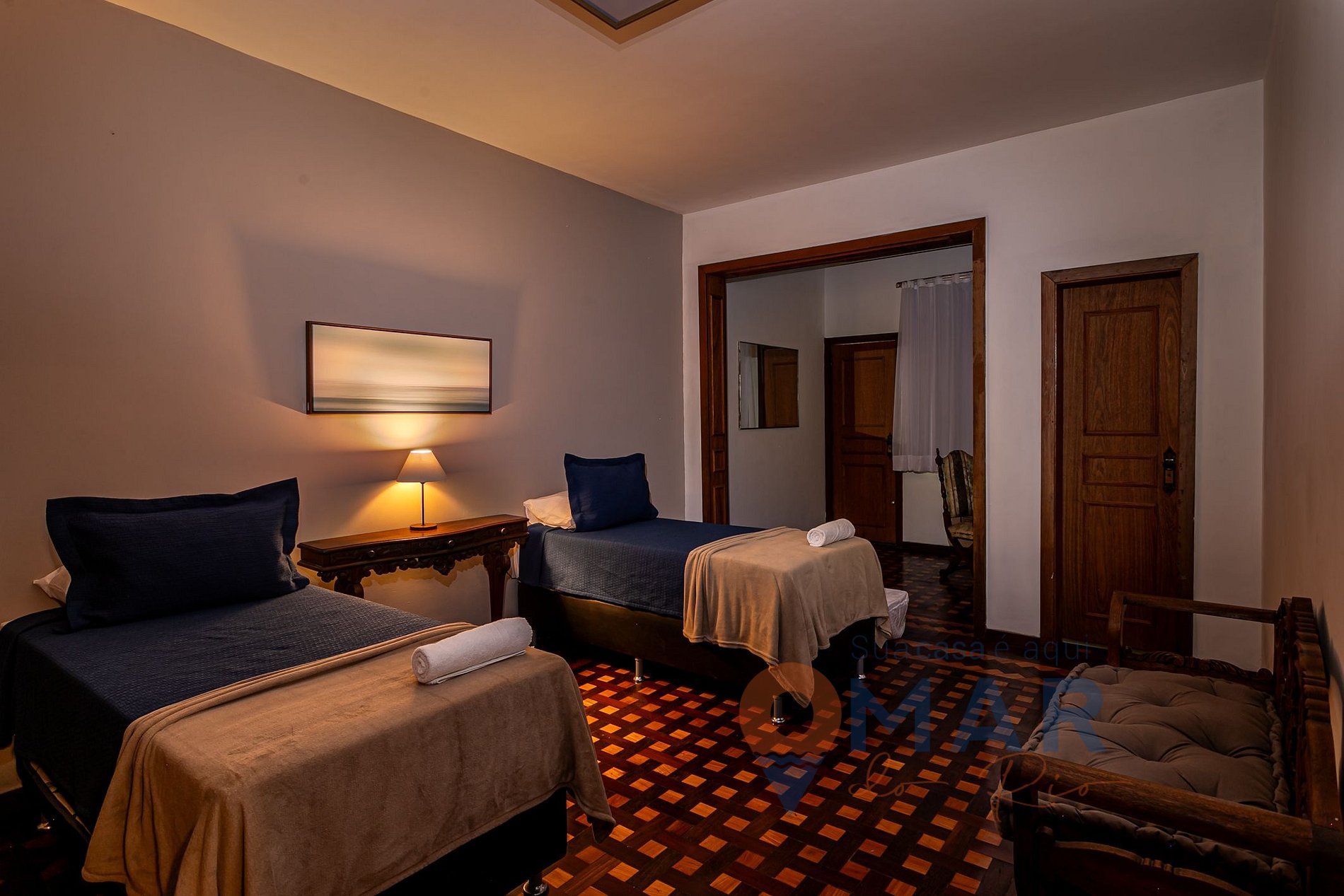 Suíte 4: 2 Camas de Solteiro (88cm x 1,88cm) com 2 camas auxiliares para crianças, ar-condicionado, armário com cabide, mesa de apoio com cadeira, banco, cortina blackout e translúcida.