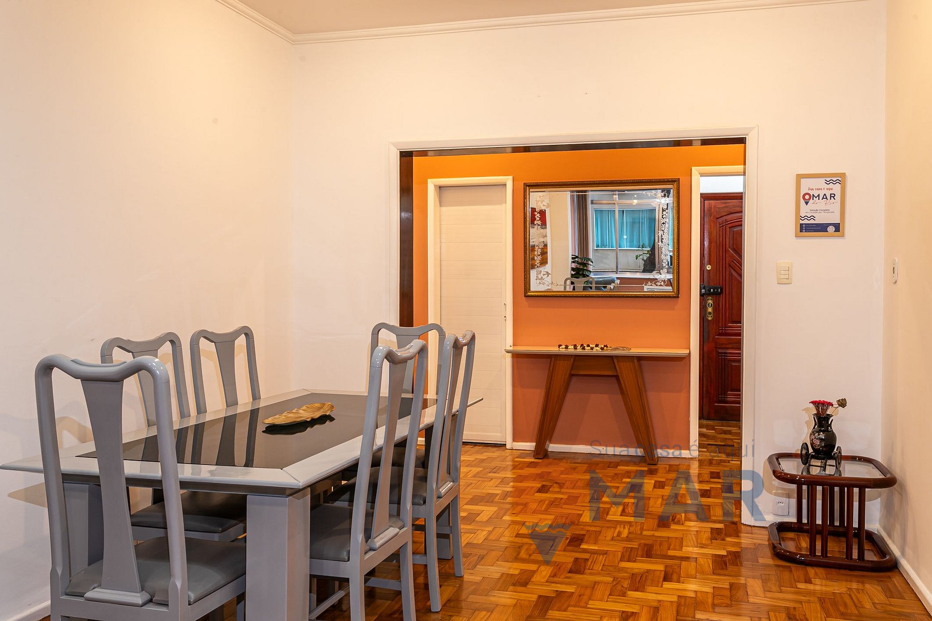 Sala de estar: Sofá, Smart TV 40" + canais à cabo(Claro TV), mesa de jantar + 6 cadeiras, poltrona, ar-condicionado, mesa auxiliar + 3 cadeiras e persiana blackout.