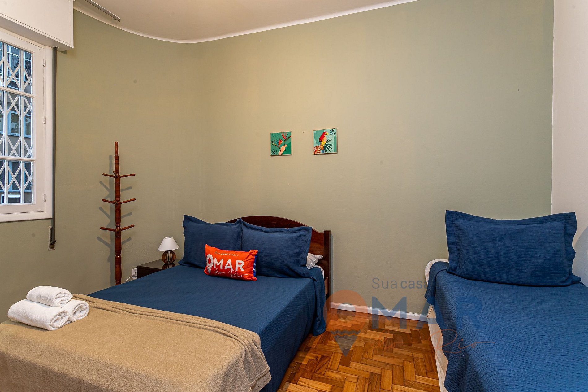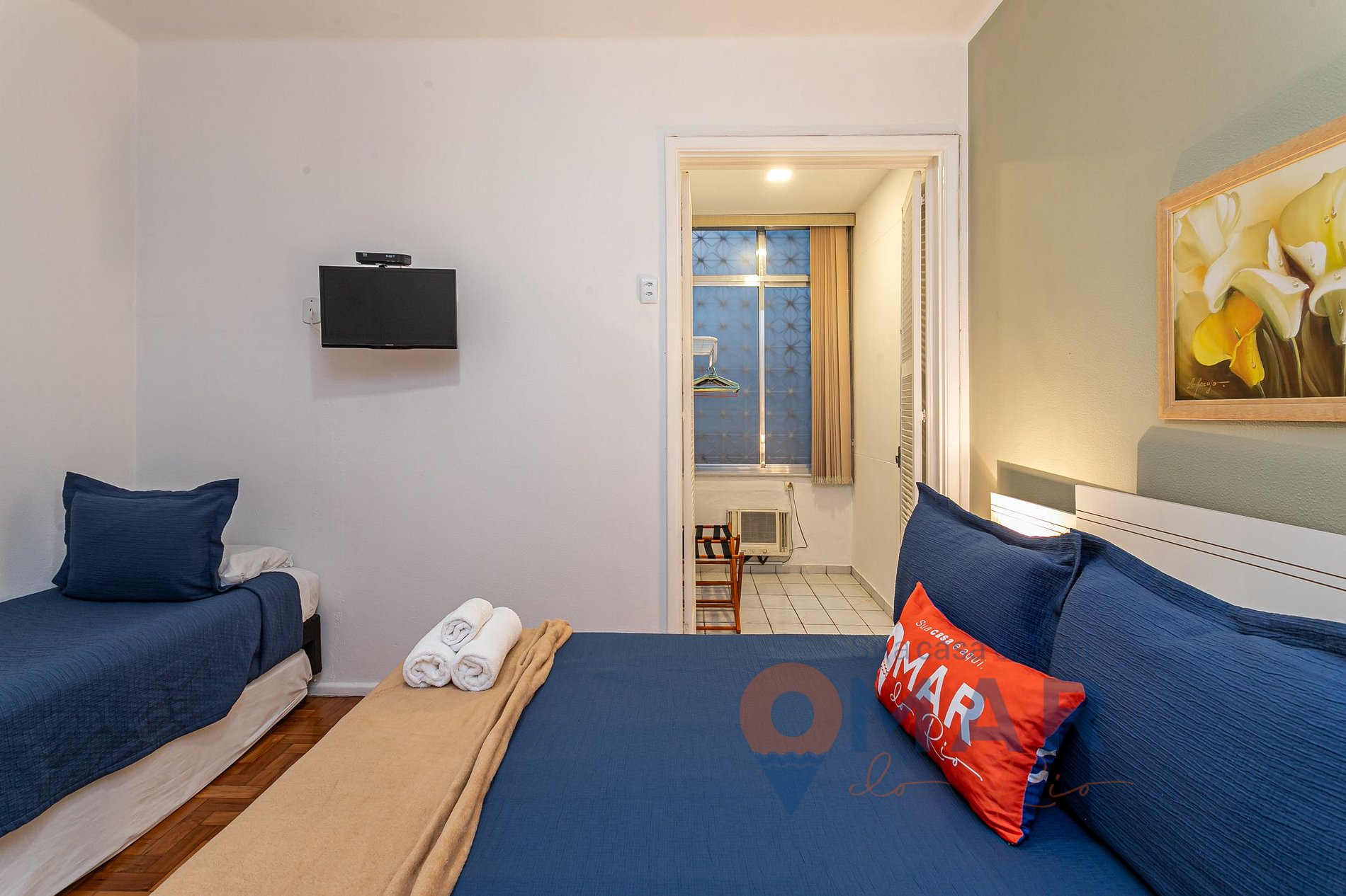 Quarto 1: Cama Queen (188cm x 138cm), cama de solteiro(188cm x 88cm) + cama auxiliar para crianças, TV 30" + canais à cabo(Claro TV), ar-condicionado, persiana blackout, 2 porta-malas, arara de roupas com prateleira e cabides.