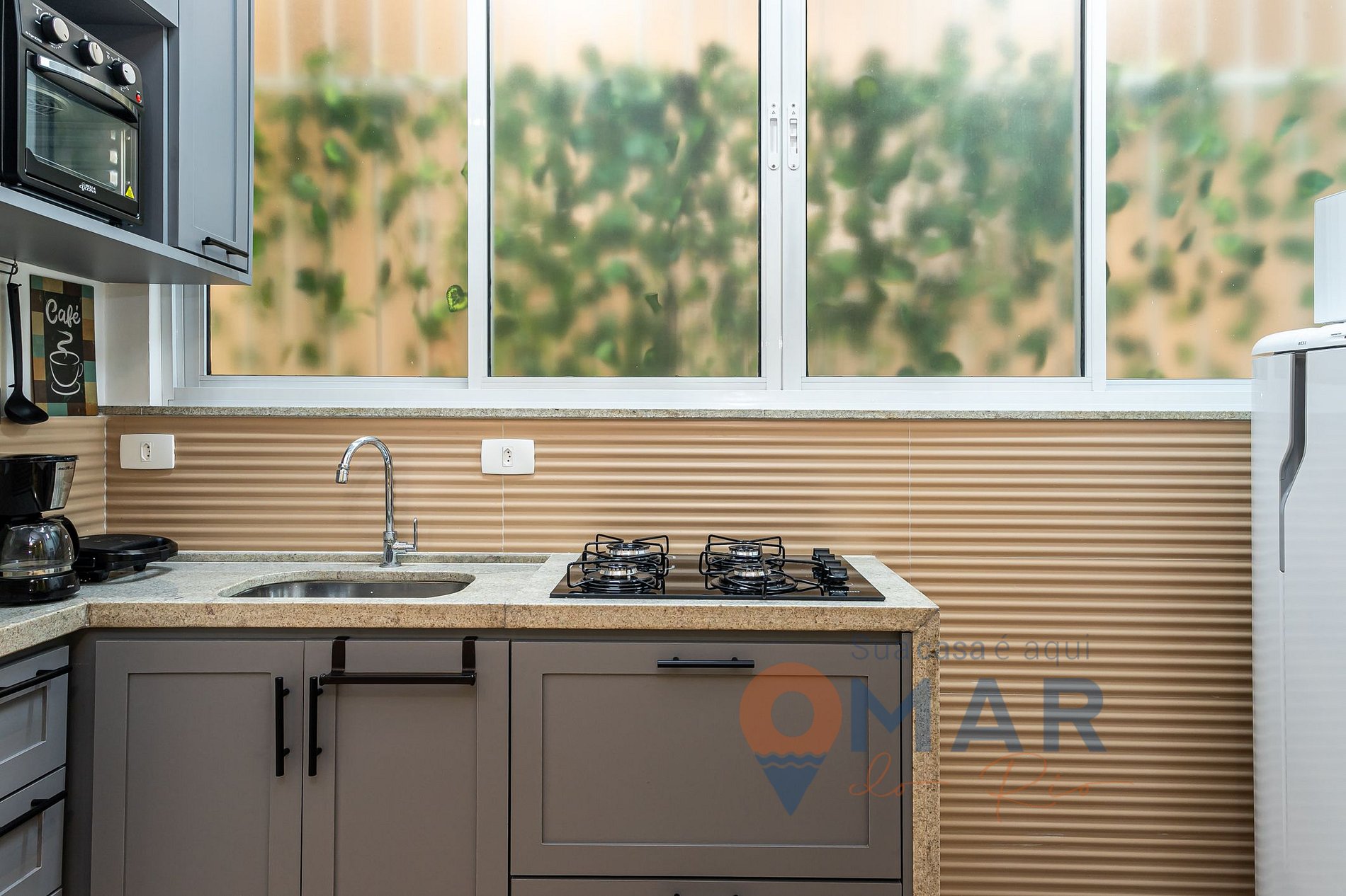 Cozinha: cooktop 4 bocas, geladeira, forno elétrico, micro-ondas, cafeteira elétrica, liquidificador, sanduicheira e utensílios.