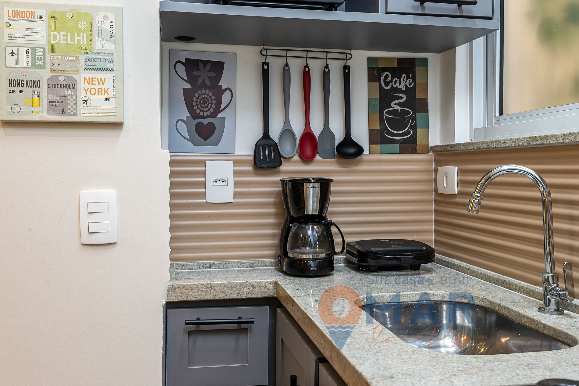 Cozinha: cooktop 4 bocas, geladeira, forno elétrico, micro-ondas, cafeteira elétrica, liquidificador, sanduicheira e utensílios.