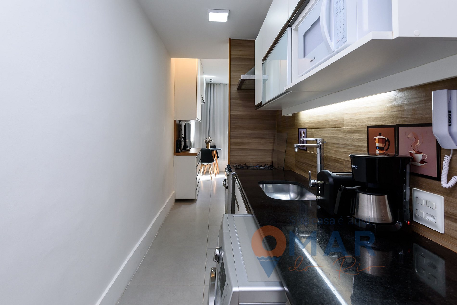 Cozinha: fogão, geladeira, forno, micro-ondas, cafeteira elétrica, cafeteira Nespresso, liquidificador, sanduicheira e utensílios.