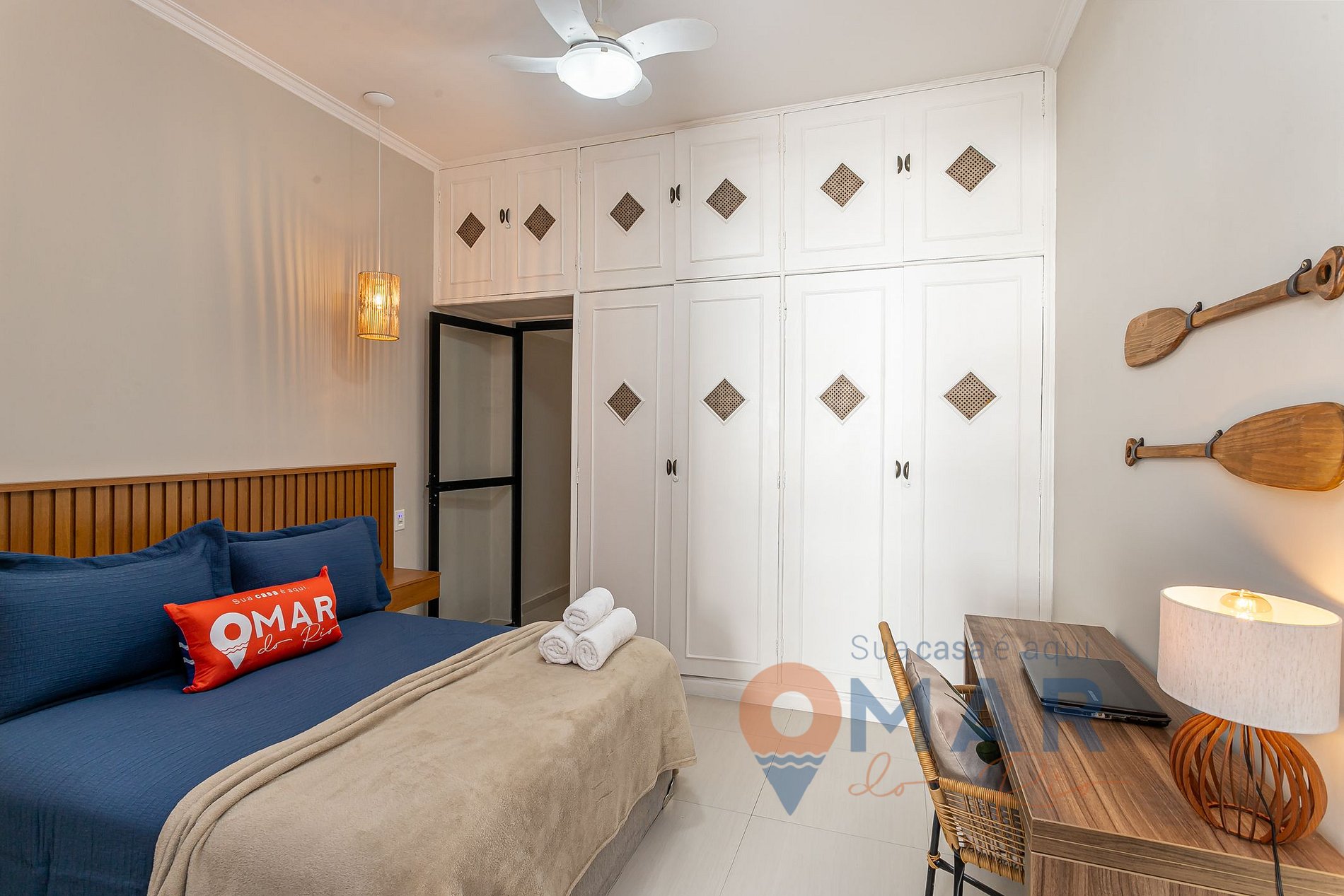Quarto: Cama Casal (188cm x 138cm), armário com cabides, workstation e ventilador de teto.