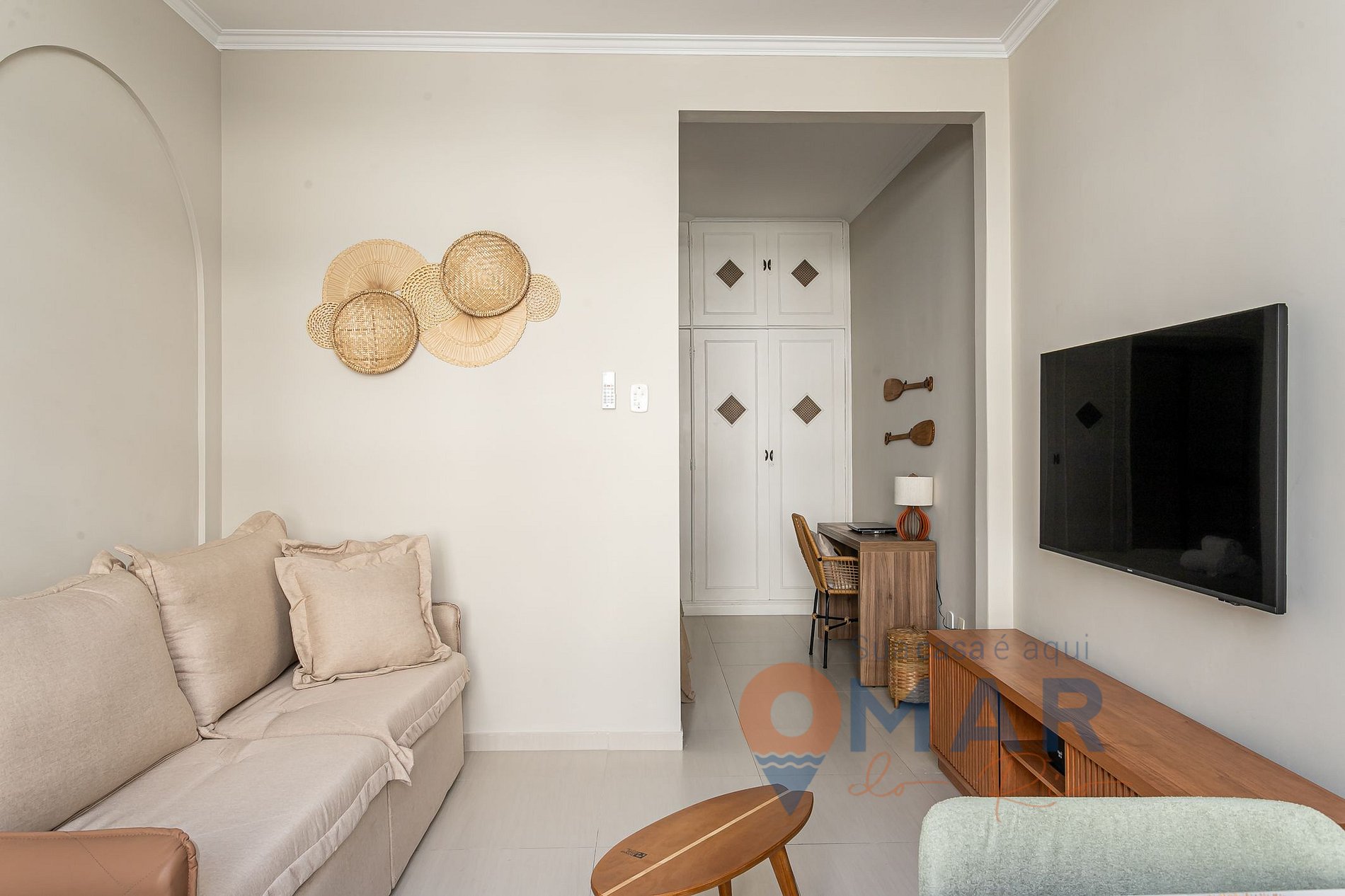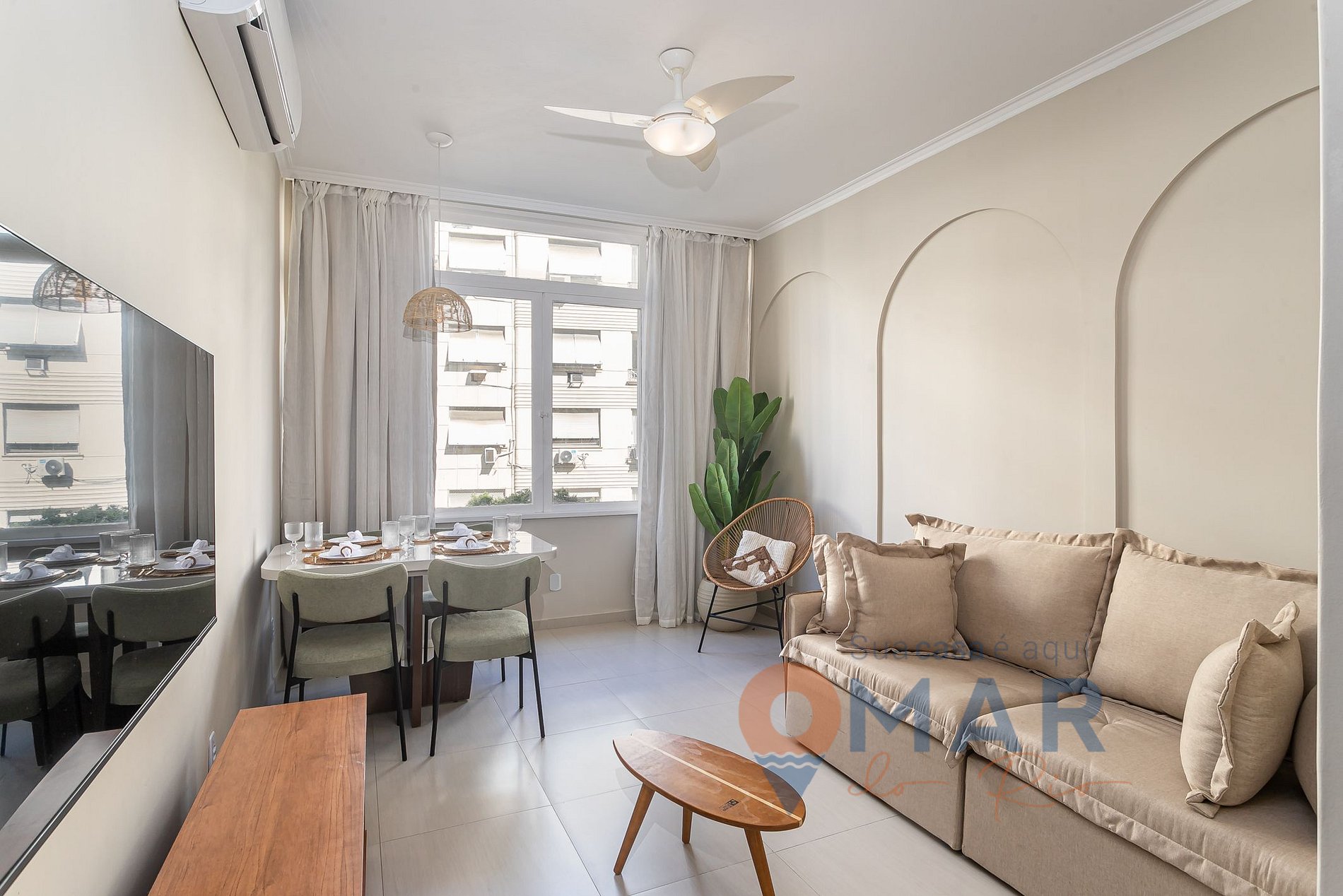Sala integrada: Smart TV 56'', sofá-cama (196cm x 128cm)- com pillowtop disponível, ar-condicionado split, cortina e mesa com 4 cadeiras.