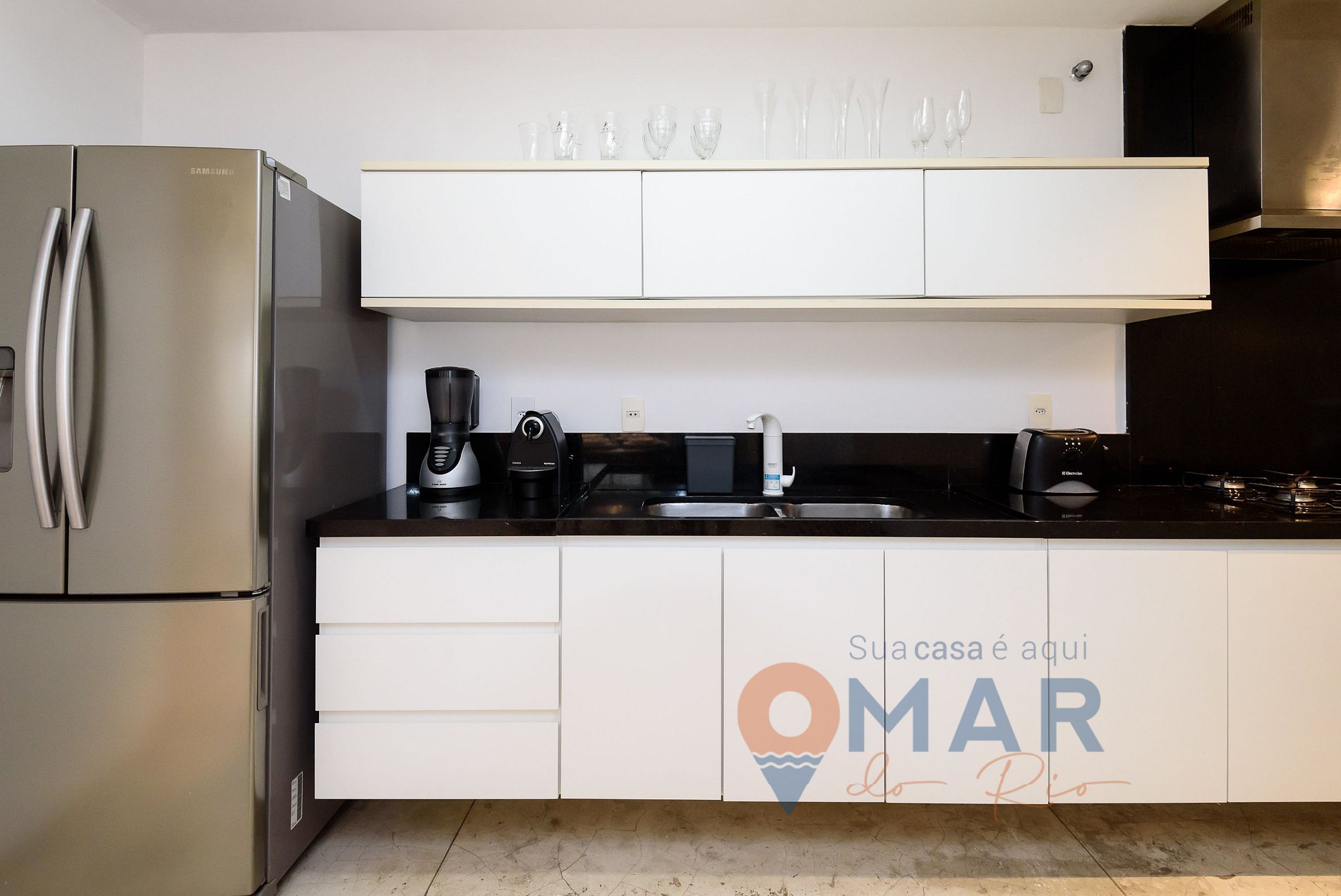 Cozinha: Geladeira side by side, fogão cooktop de 4 bocas, coifa, micro-ondas, torradeira, cafeteira elétrica, liquidificador e utensílios para cozinhar.