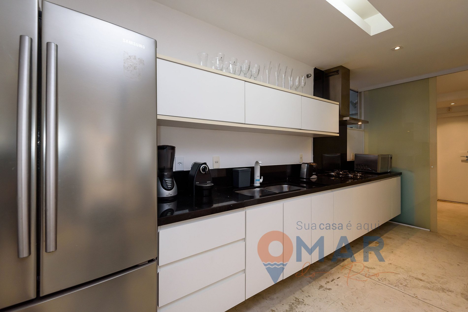 Cozinha: Geladeira side by side, fogão cooktop de 4 bocas, coifa, micro-ondas, torradeira, cafeteira elétrica, liquidificador e utensílios para cozinhar.