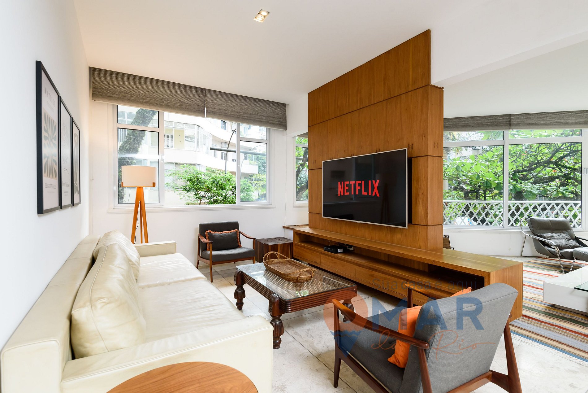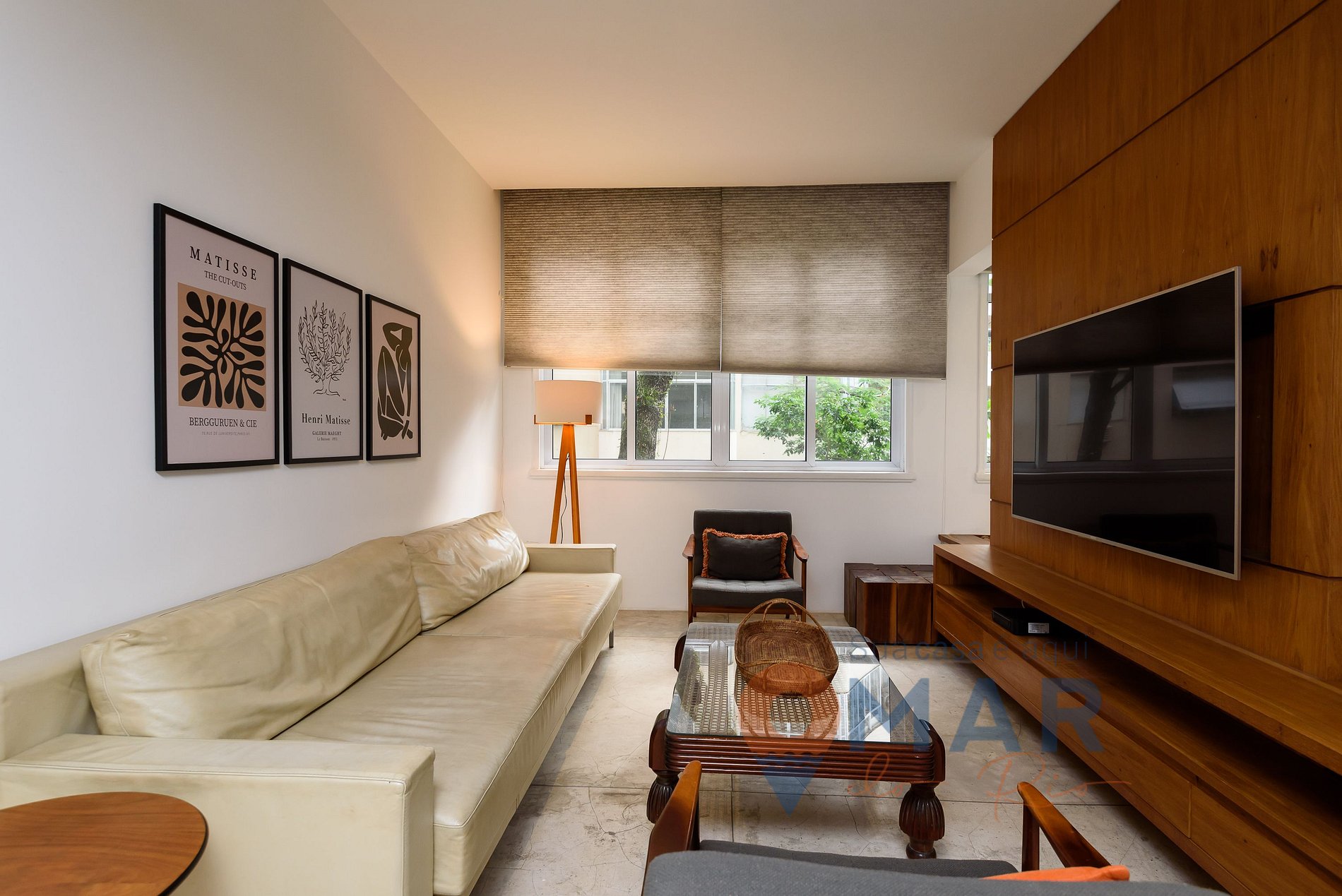 Sala: Sofá, ar-condicionado split, smart TV 65" com antena digital, poltronas, mesa de jantar com 6 cadeiras e cortina translúcida.