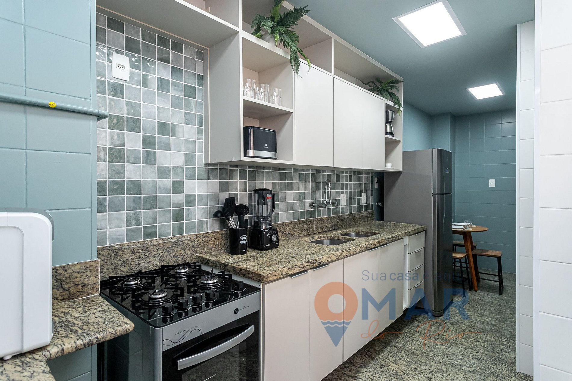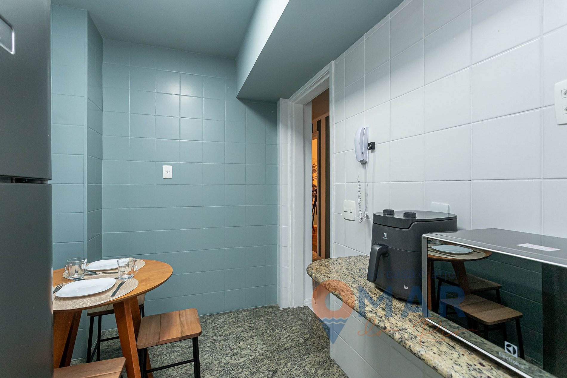 Cozinha: geladeira, fogão 4 bocas com forno, micro-ondas, air fryer, cafeteira elétrica, purificador de água com água natural e gelada, liquidificador, torradeira, mesa de jantar com 2 cadeiras e utensílios para cozinhar.