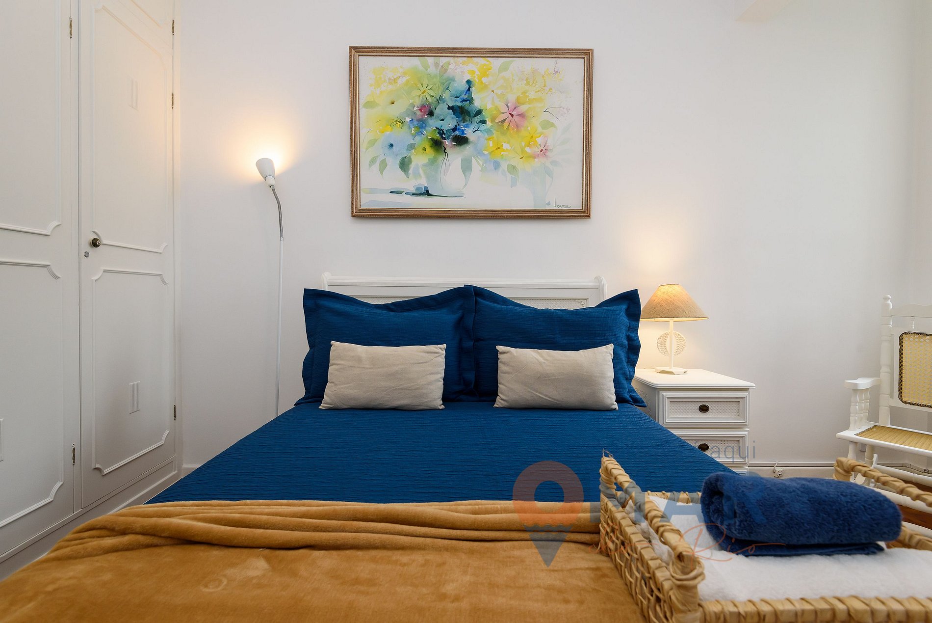 Quarto 1: Cama casal (188cm x 138cm), armários, ar-condicionado, ventilador de teto, cortina black-out e tela de proteção.