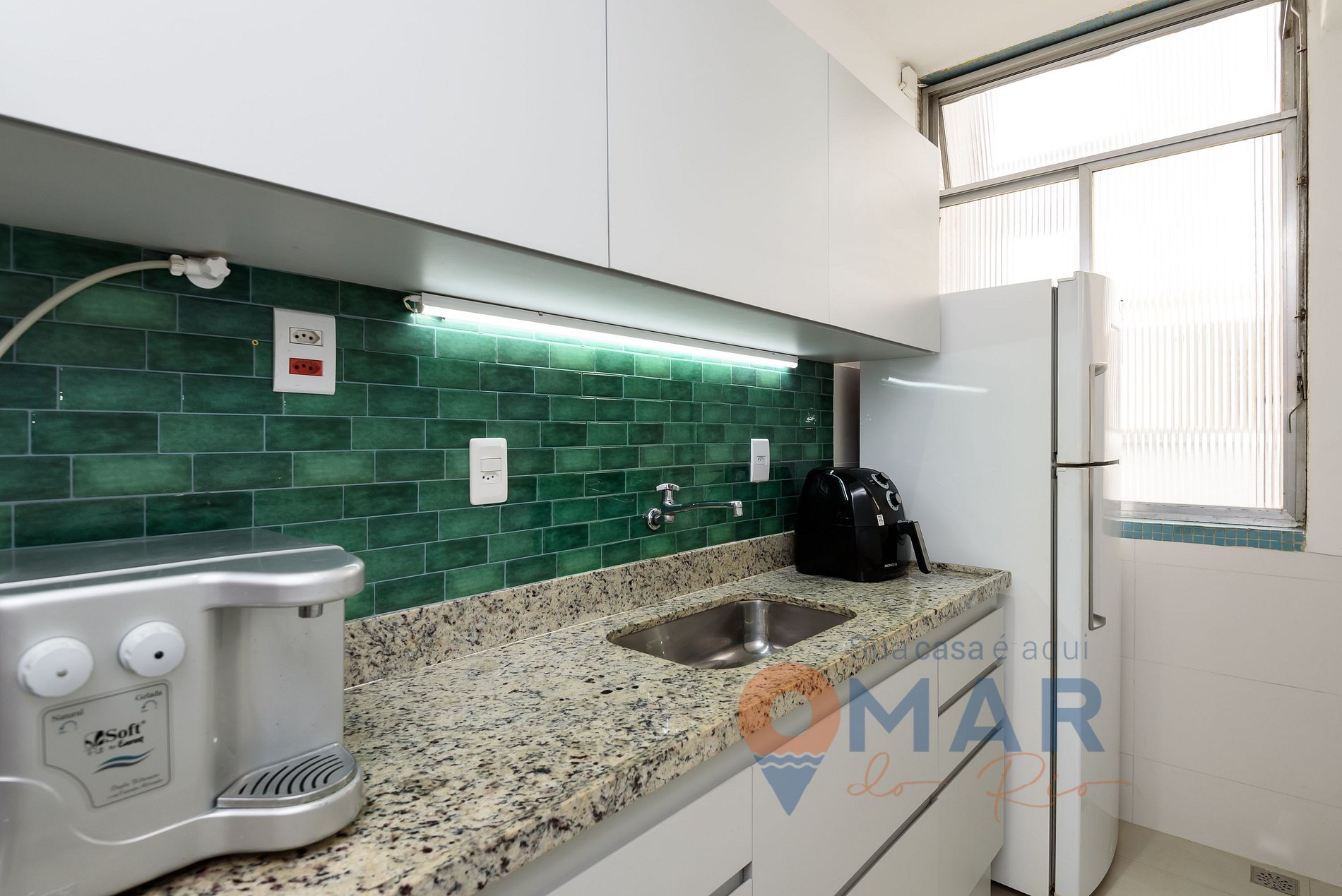 Cozinha: fogão 4 bocas, geladeira, micro-ondas, cafeteira, liquidificador, sanduicheira, purificador de água, air fryer e utensílios de cozinhar.