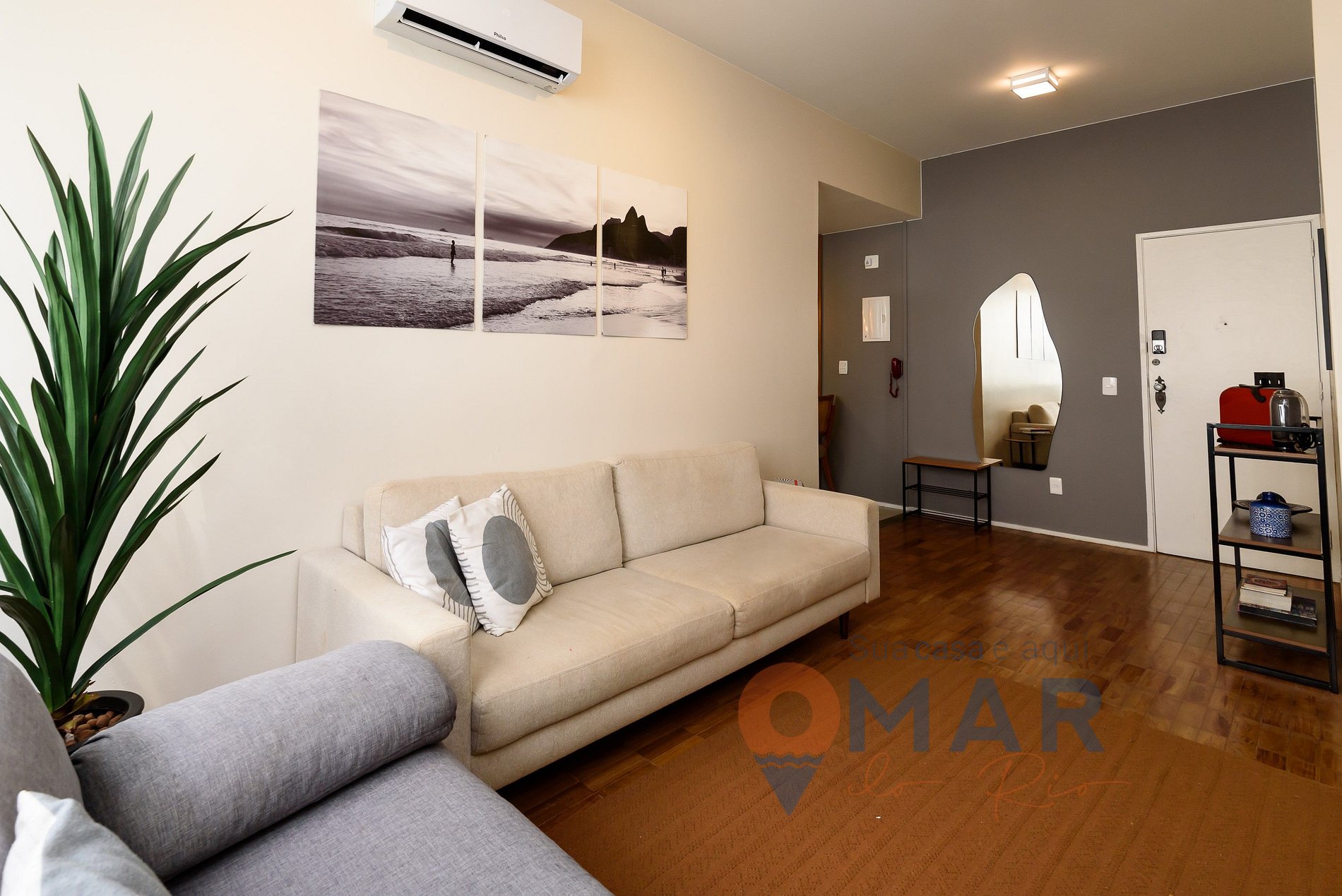 Sala: sofás, Smart TV com canais (antena digital), ar-condicionado split, mesa de jantar com cadeiras, espelho de corpo inteiro e cortina translúcida.