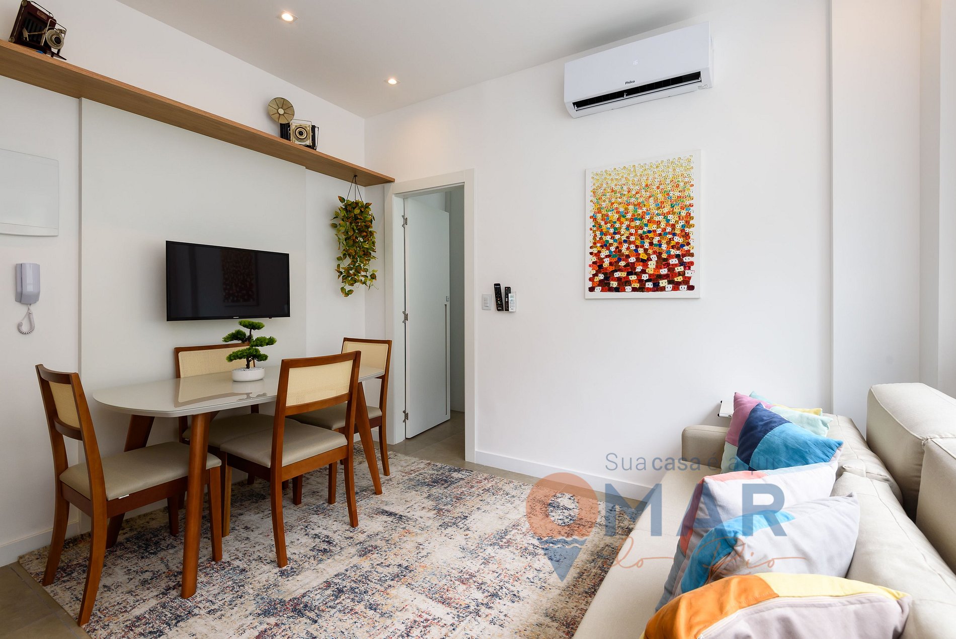 Sala: Sofá-cama (158cm x 188cm), ar-condicionado, Smart TV, mesa de jantar + 4 cadeiras e cortina.