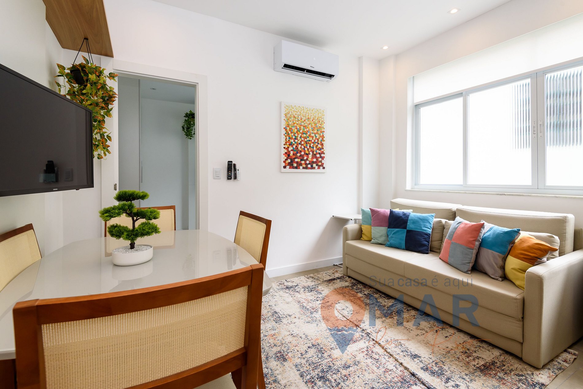 Sala: Sofá-cama (158cm x 188cm), ar-condicionado, Smart TV, mesa de jantar + 4 cadeiras e cortina.
