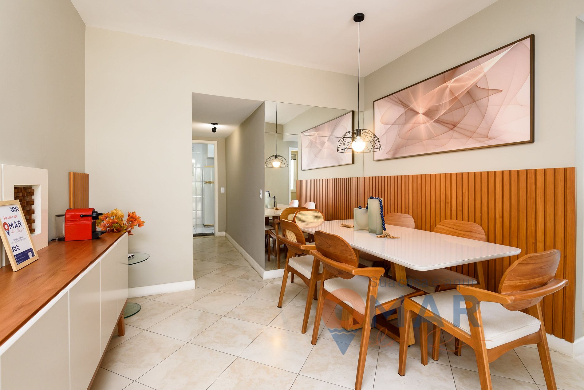 Sala: Sofá, Smart TV com canais abertos (antena digital), mesa de jantar com cadeiras e ar-condicionado.