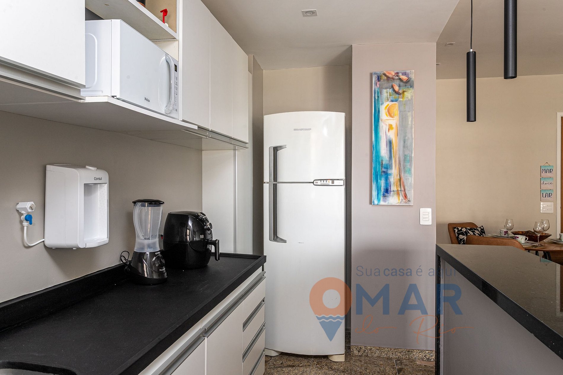 Cozinha: geladeira, fogão 4 bocas com forno, micro-ondas, air fryer, cafeteira expresso, purificador de água, liquidificador e utensílios para cozinhar.