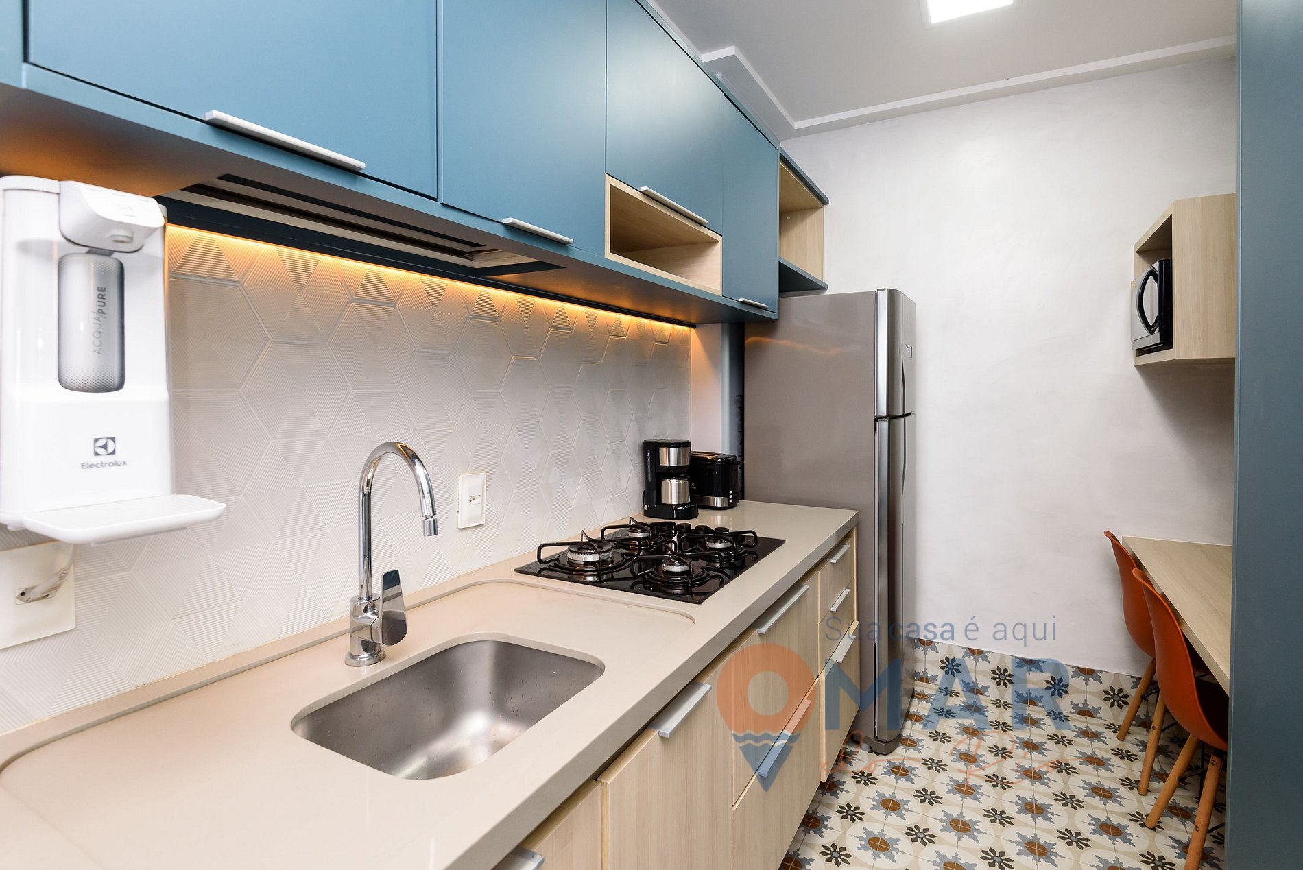 Cozinha: Geladeira, fogão, cafeteira, torradeira, liquidificador, micro-ondas, purificador de água e utensílios de cozinha.