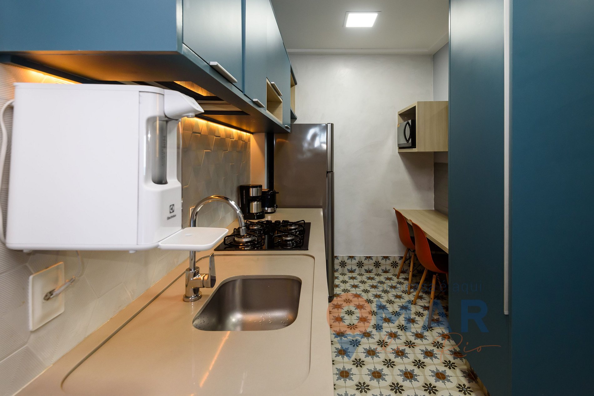 Cozinha: Geladeira, fogão, cafeteira, torradeira, liquidificador, micro-ondas, purificador de água e utensílios de cozinha.