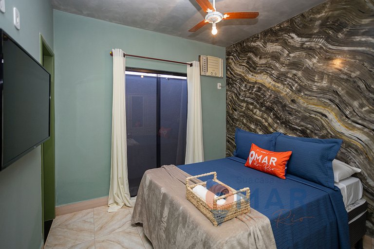 Suíte 2 (1º andar): Cama casal padrão (188cm x 138cm), Smart TV 32", ar-condicionado, ventilador de teto, guarda-roupas e cortina.